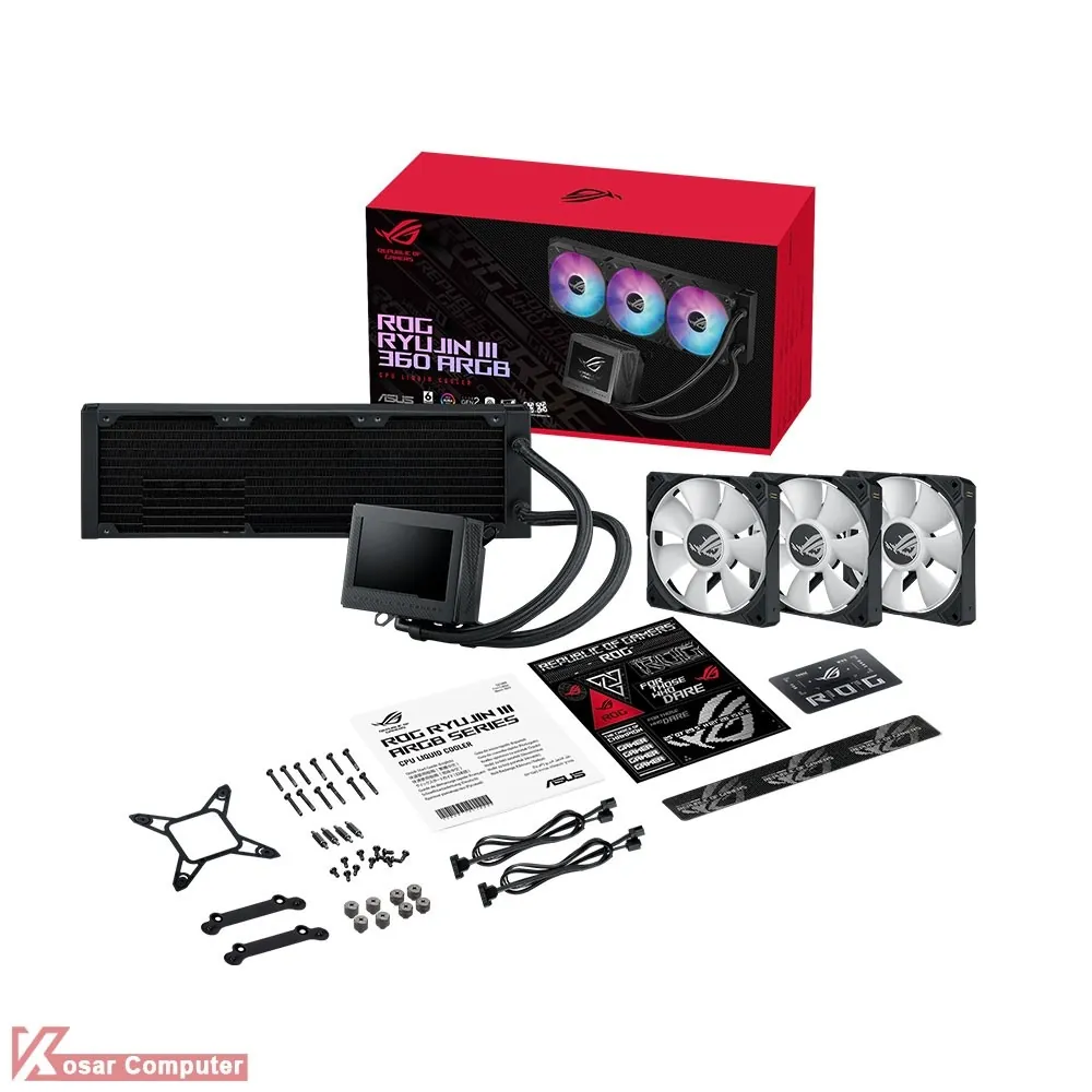 خنک کننده مایع پردازنده ایسوس مدل ASUS ROG RYUJIN III 360 ARGB دارای 3 عدد فن 120 میلی متری ARGB با حداکثر سرعت 2200 دور در دقیقه می باشد و با اکثر سوکت های اینتل از جمله LGA1700 و ای ام دی AM5 سازگاری دارد.