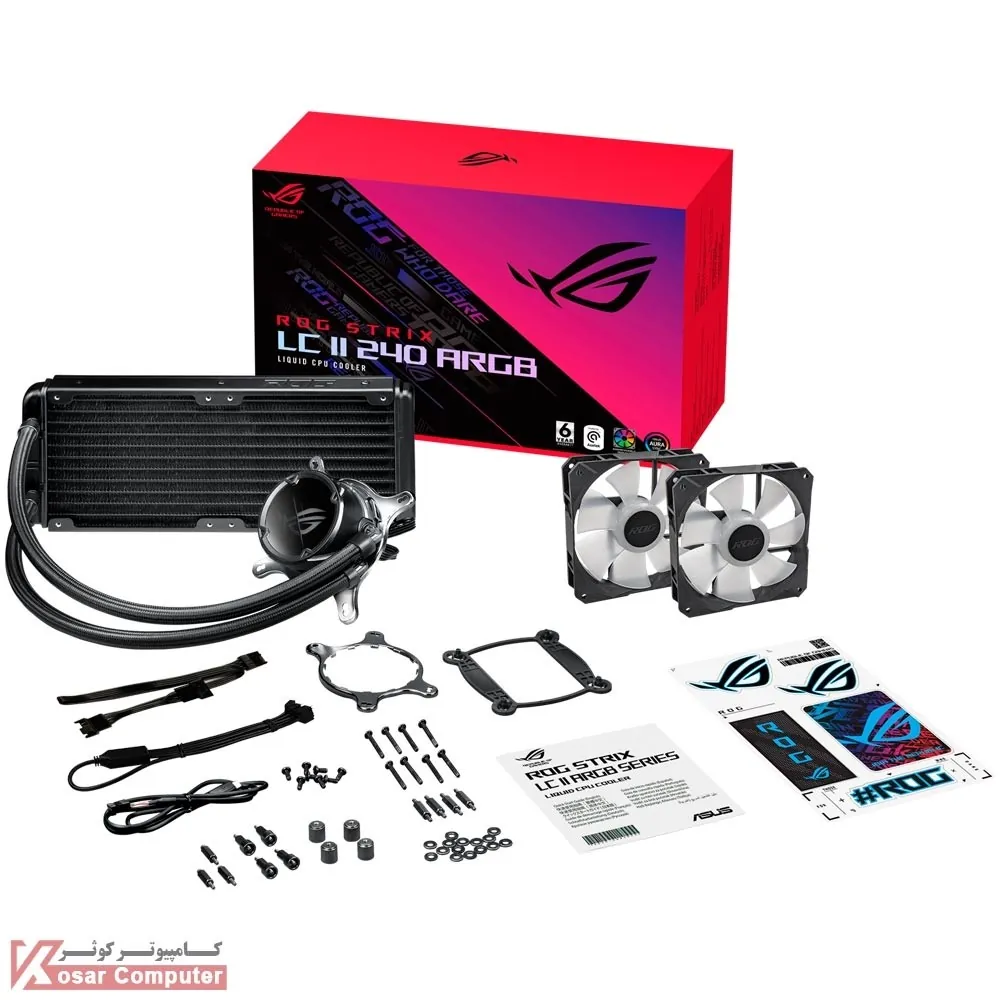 خنک کننده مایع ROG STRIX LC II 240 ARGB محصولی قدرتمند از شرکت بزرگ ایسوس است.این خنک کننده دارای 2 عدد فن است که هم پردازنده شما را خنک می سازد و هم جلوه ی زیبایی به سیستم شما می بخشد.همچنین دارای حداکثر سرعت 2500 دور در دقیقه است و با اکثر پردا