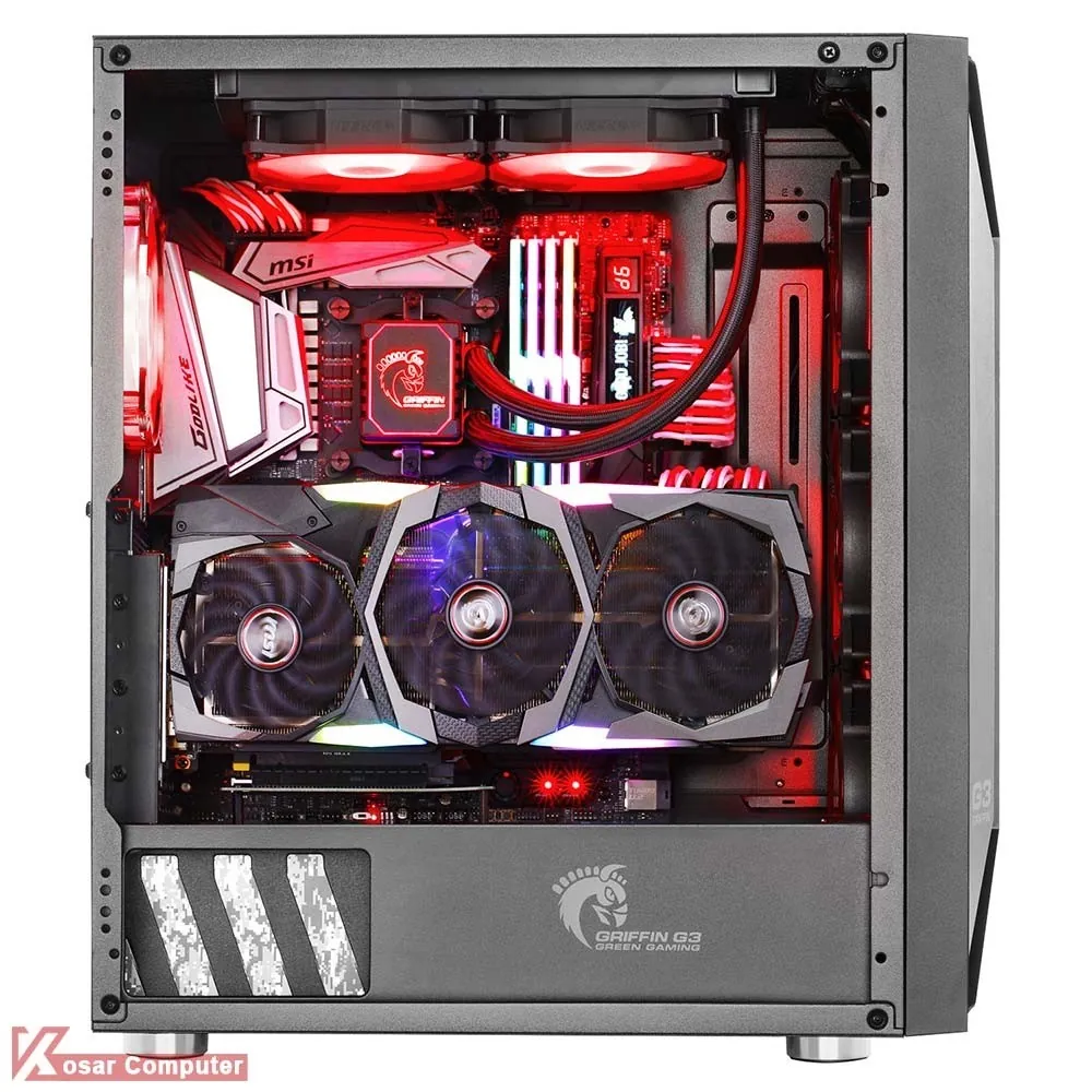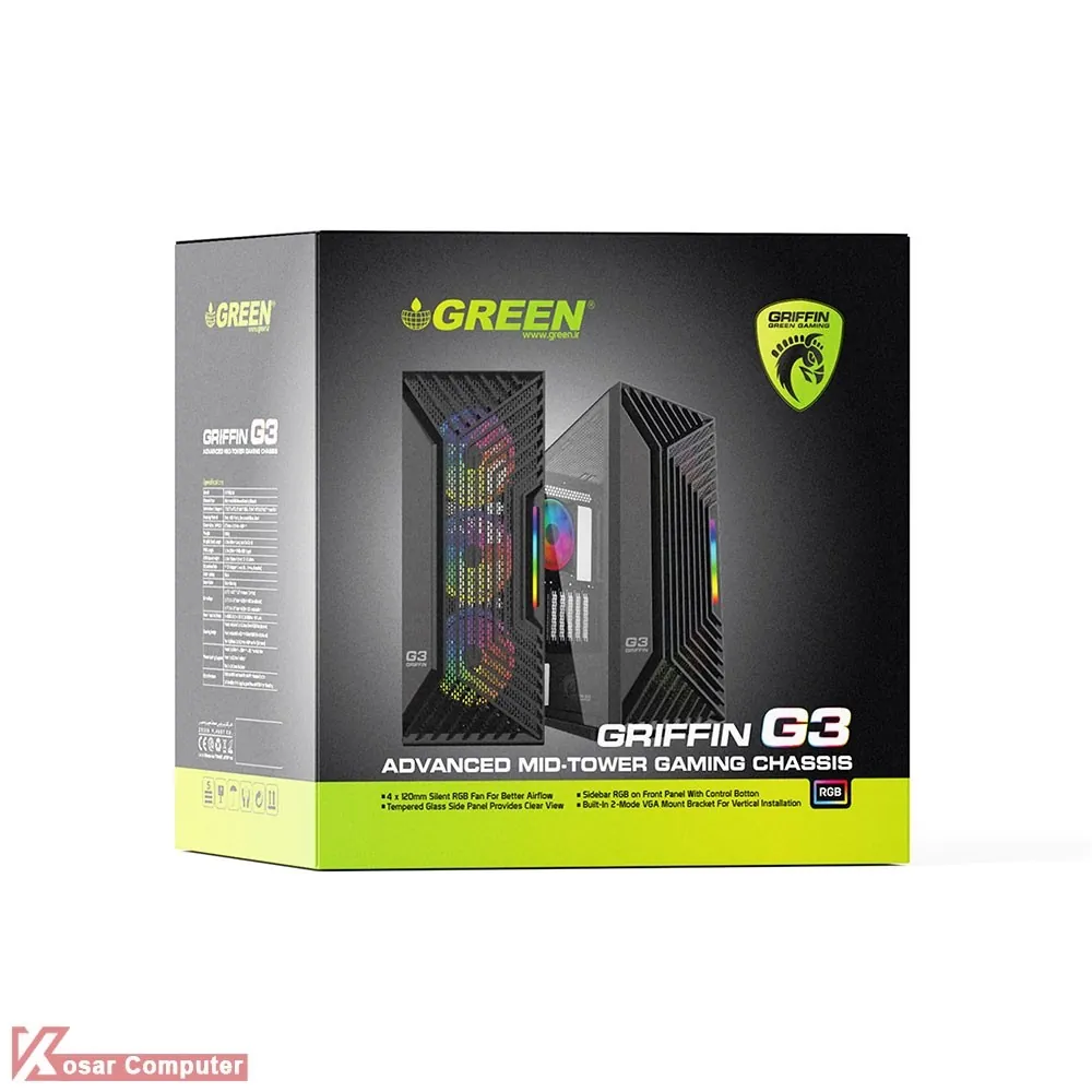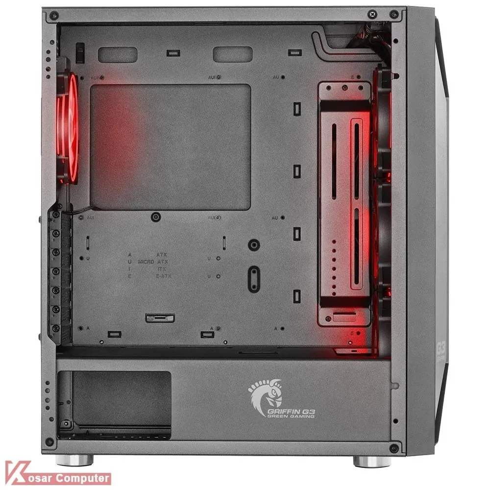 کیس گیمینگ گرین GRIFFIN G3 دارای درب شیشه ای و ظاهری زیباست.این کیس دارای 6 عدد جایگاه فن و 5 عدد جایگاه 2.5 اینچ و 2 عدد جایگاه 3.5 اینچ می باشد.در پنل جلویی هم دو عدد پورت USB 3.0 و دو عدد پورت USB 2.0 موجود است.
