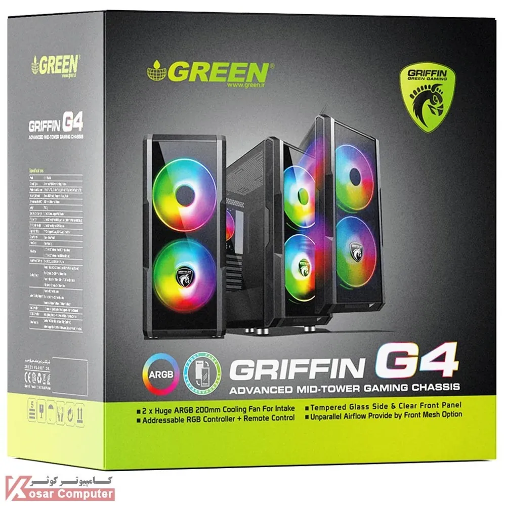 کیس گیمینگ گرین GRIFFIN G4 دارای درب شیشه ای و ظاهری زیباست.این کیس دارای 8 عدد جایگاه فن و 4 عدد جایگاه 2.5 اینچ و 4 عدد جایگاه 3.5 اینچ می باشد.در پنل جلویی هم دو عدد پورت USB 3.0 و دو عدد پورت USB 2.0 موجود است.