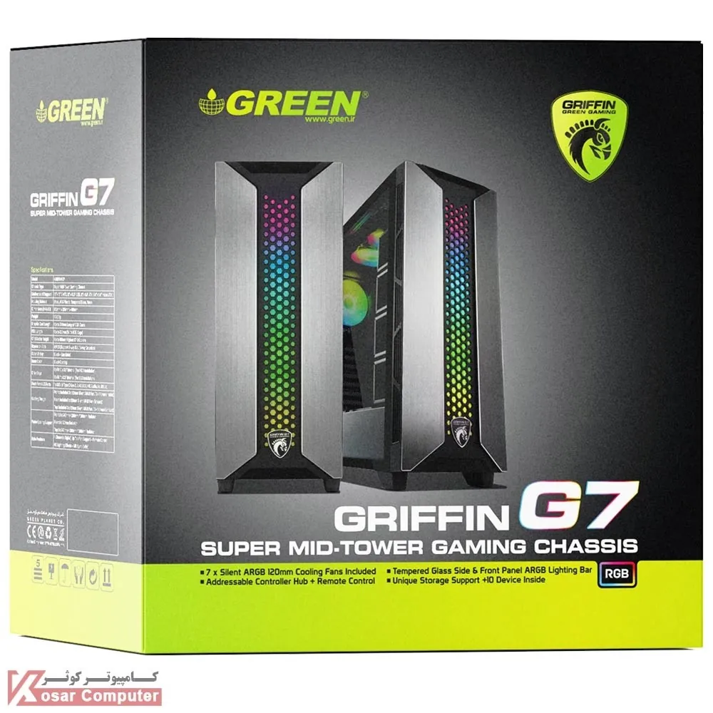 کیس گیمینگ گرین GRIFFIN G7 دارای درب شیشه ای و ظاهری زیباست.این کیس دارای 7 عدد جایگاه فن و 5 عدد جایگاه 2.5 اینچ و 10 عدد جایگاه 3.5 اینچ می باشد.در پنل جلویی هم 1 عدد پورت USB 3.1 Gen 2 Type-C ، دو عدد پورت USB 3.0 و یک عدد پورت USB 2.0 موجود است