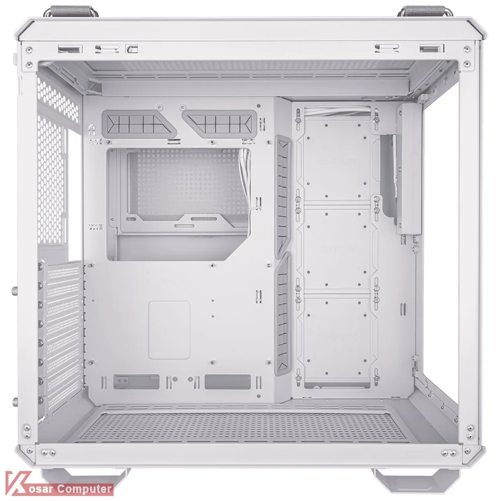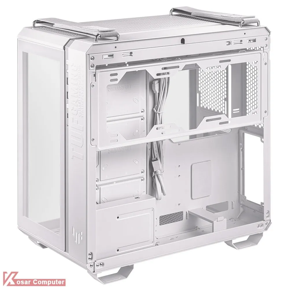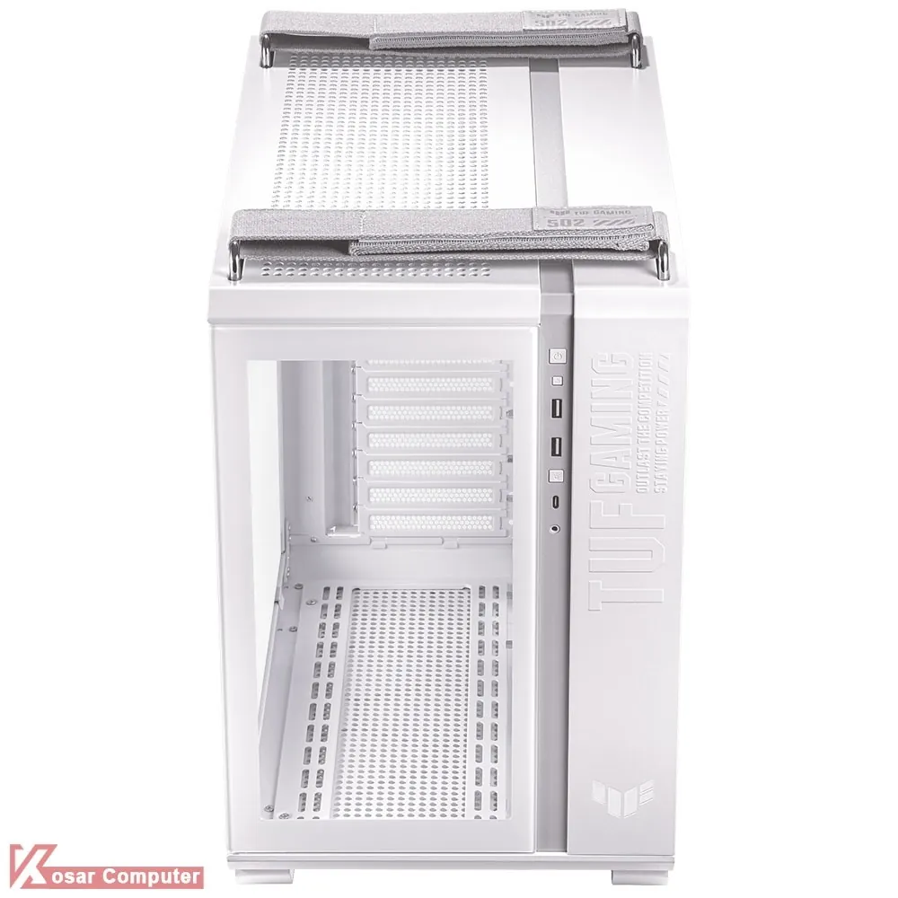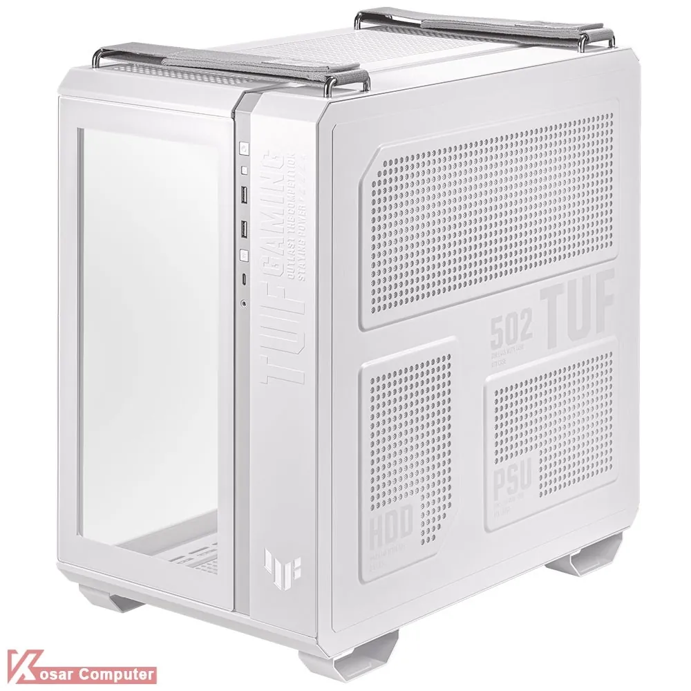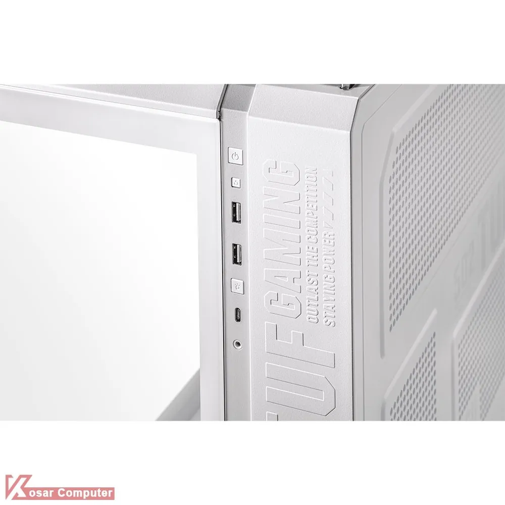 کیس گیمینگ سفید ایسوس TUF Gaming GT502 دارای درب شیشه ای و ظاهری زیباست.این کیس دارای 13 عدد جایگاه فن و 4 عدد جایگاه 2.5 اینچ و 3.5 اینچ می باشد.در پنل جلویی هم 2 عدد پورت USB 3.2 Gen1 و 1 عدد پورت USB 3.2 Gen2 Type C به همراه دکمه کنترل led موجود می باش