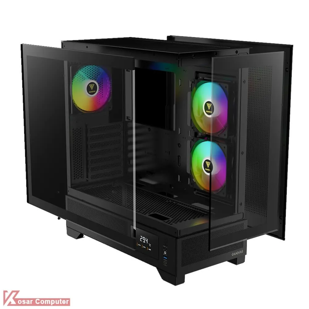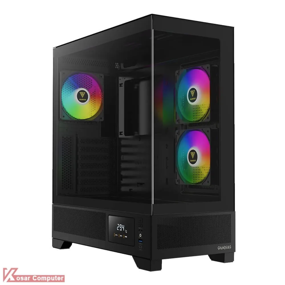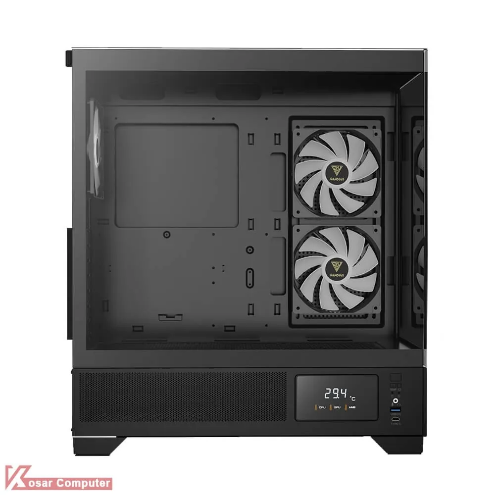 کیس گیم دیاس مدل GAMDIAS ATLAS M1 دارای 6 عدد جایگاه فن می باشد که شرکت 3 عدد فن از نوع ARGB روی آن نصب کرده است.در پنل جلویی USB3.0 و USB TYPE-C همراه کنترلر LED و نمایشگر موجود می باشد.همچنین در قسمت بالایی کیس 360 میلی متر کولینگ پشتیبانی می
