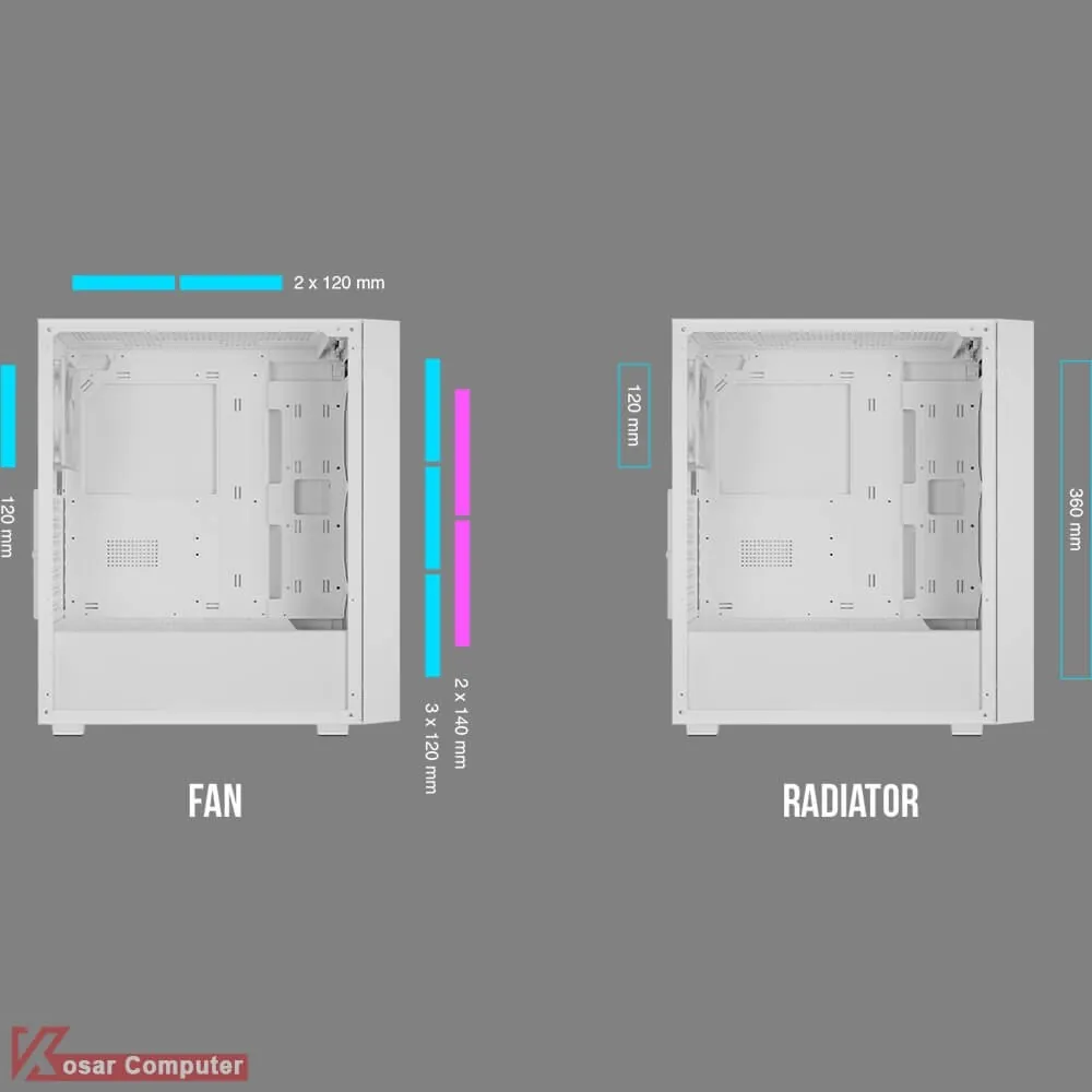 | قابلیت نصب فن قسمت جلو کیس | 3 عدد 120 یا 2 عدد 140 میلی متر (3 عدد فن 120 میلی متری RGB بر روی کیس نصب شده است) |