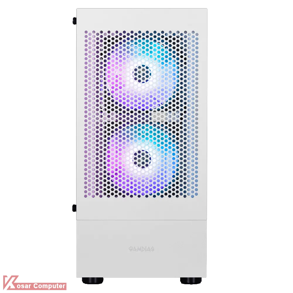 کیس گیم دیاس مدل GAMDIAS TALOS E3 MESH WH دارای 5 عدد جایگاه فن می باشد که شرکت 3 عدد فن 120 میلی متری از نوع ARGB روی آن نصب کرده است.در پنل جلویی USB3.0 و USB 2.0 همراه کنترلر LED موجود می باشد.همچنین در قسمت جلویی کیس 360 میلی متر کولینگ پشتیبانی می ش