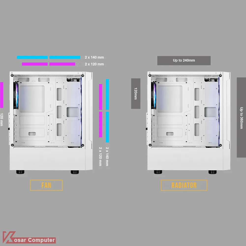 قابلیت نصب رادیاتور واتر کولینگ جلوی ک280 / 360 میلی متر هارد قابل جابجایی است در قسمت جلویی برای پشتیبانی خنک کننده 360