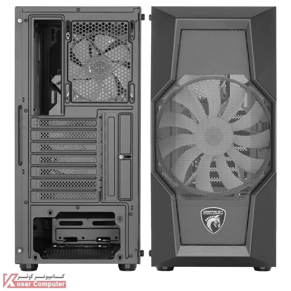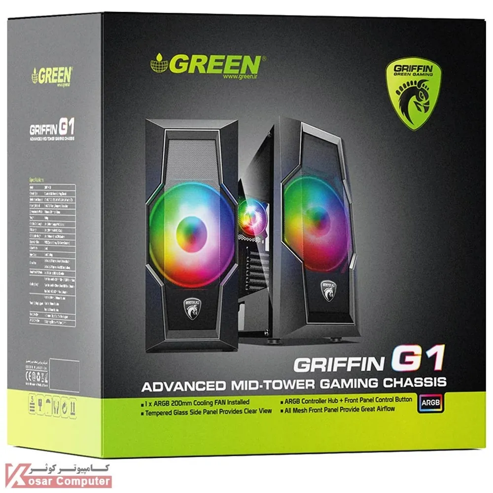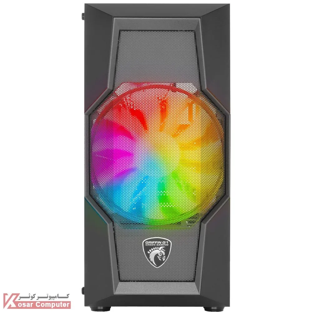 کیس گیمینگ گرین GRIFFIN G1 دارای درب شیشه ای و ظاهری زیباست.این کیس دارای 6 عدد جایگاه فن و 4 عدد جایگاه 2.5 اینچ و 2 عدد جایگاه 3.5 اینچ می باشد.در پنل جلویی هم 1 عدد پورت USB 3.0 و 2 عدد پورت USB 2.0 موجود است.بر روی این کیس 2 عدد فن ARGB نصب شده است