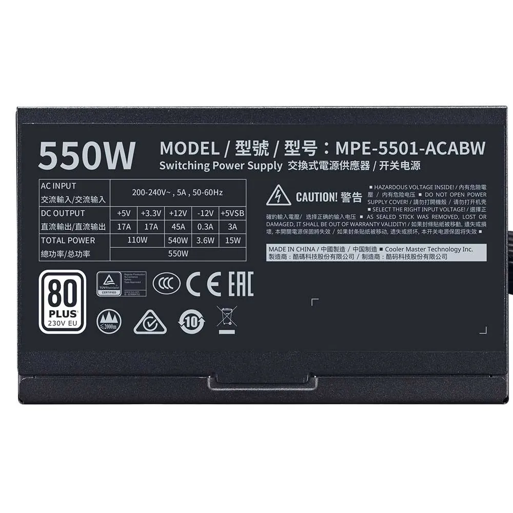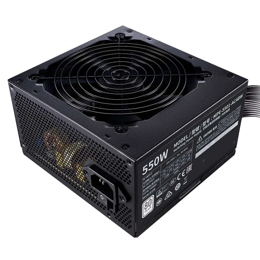 پاور کولرمستر مدل MWE 550 WHITE 230V V2 دارای 550 وات توان می باشد و به صورت غیر ماژولار است.این پاور دارای گواهینامه 80PLUS Standard می باشد و در قسمت پایینی هم یک عدد فن 120 میلی متری موجود است.بر روی این پاور 6 عدد کانکتور ساتا ، 3 عدد کانکتور PERIPHER