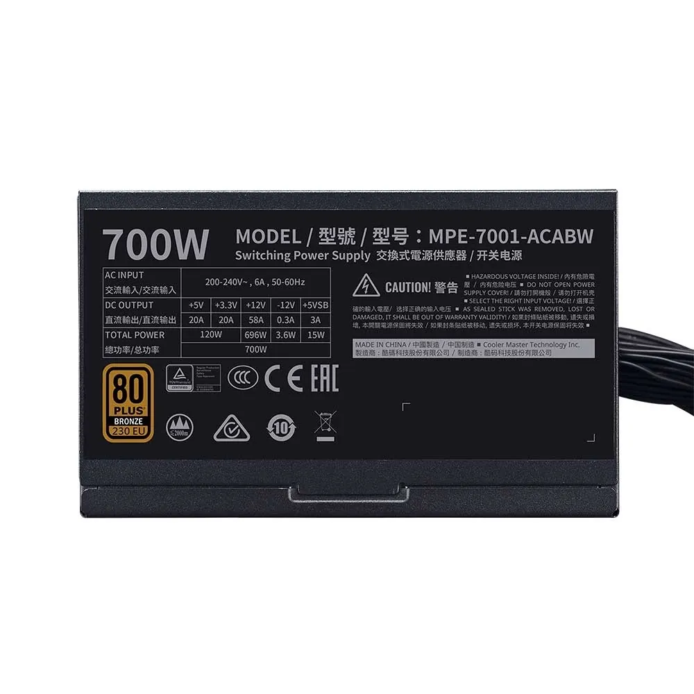 پاور کولرمستر مدل MWE 700 BRONZE V2 230V دارای 700 وات توان می باشد و به صورت غیر ماژولار است.این پاور دارای گواهینامه 80PLUS Bronze و راندمان 88 درصد (Efficiency 88%) می باشد.بر روی این پاور 6 عدد کانکتور ساتا ، 4 عدد کانکتور PCI-E 6+2