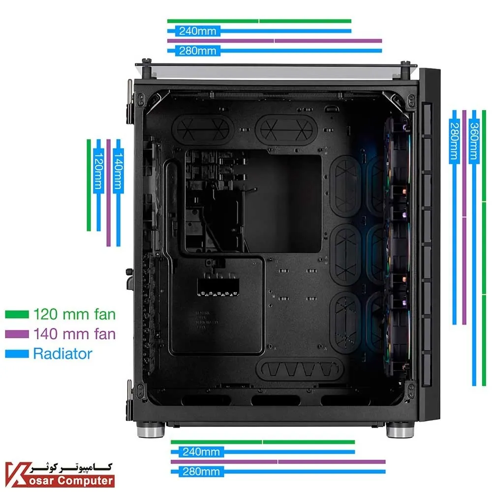 قابلیت نصب فن قسمت جلو کیس3 عدد فن 120 یا 2 عدد فن 140 میلی متری (3 عدد فن 120 میلی متری RGB بر روی کیس نصب شده است)