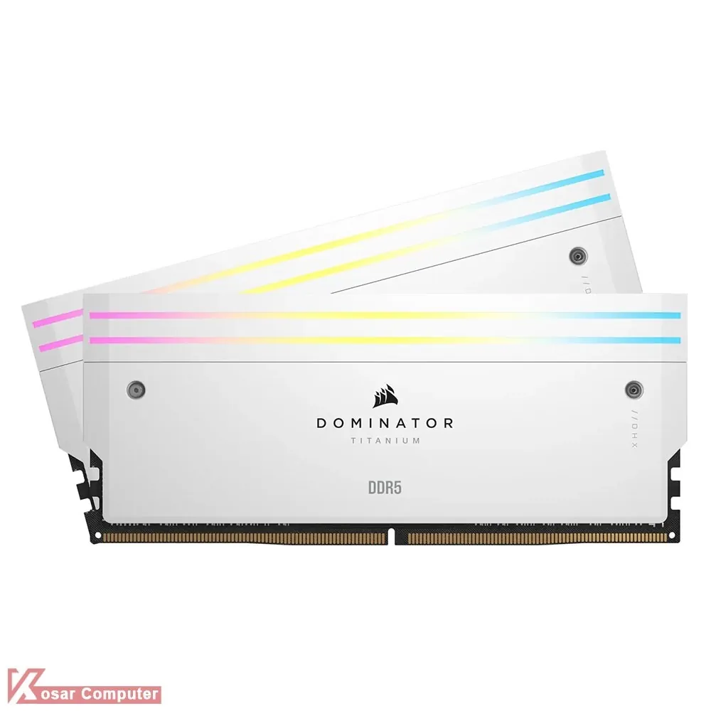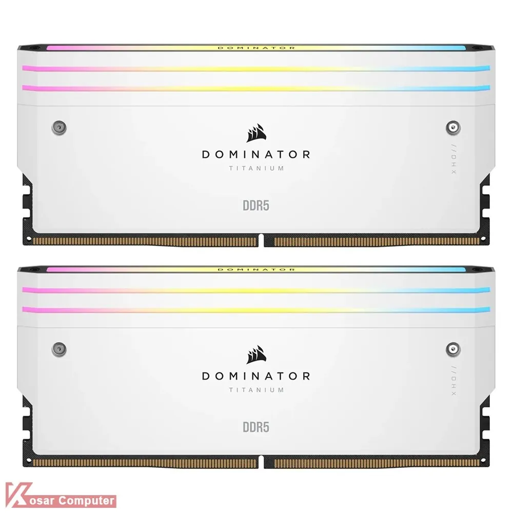 رم قدرتمند و زیبای کورسیر سفید رنگ Dominator Titanium RGB WHITE DDR5 ظرفیت 32 گیگابایت به صورت 2 کاناله است و دارای هیست سینک ، باس 6000 مگاهرتز و تاخیر CL30 است و مناسب سیستم های گیمینگ ، پردازشی و رندرینگ می باشد.
