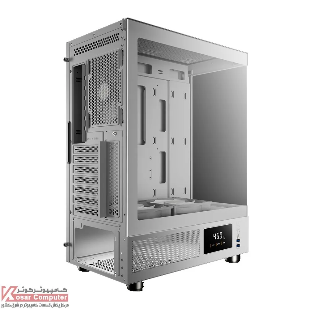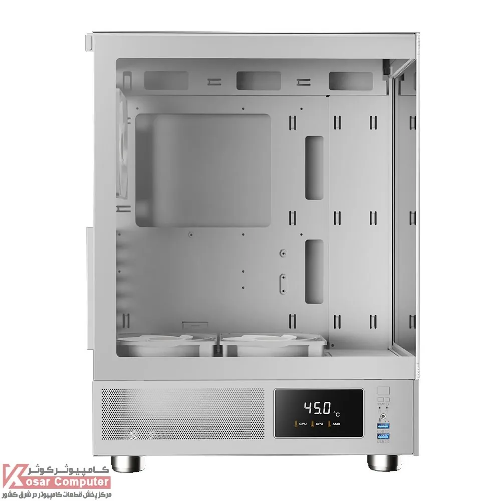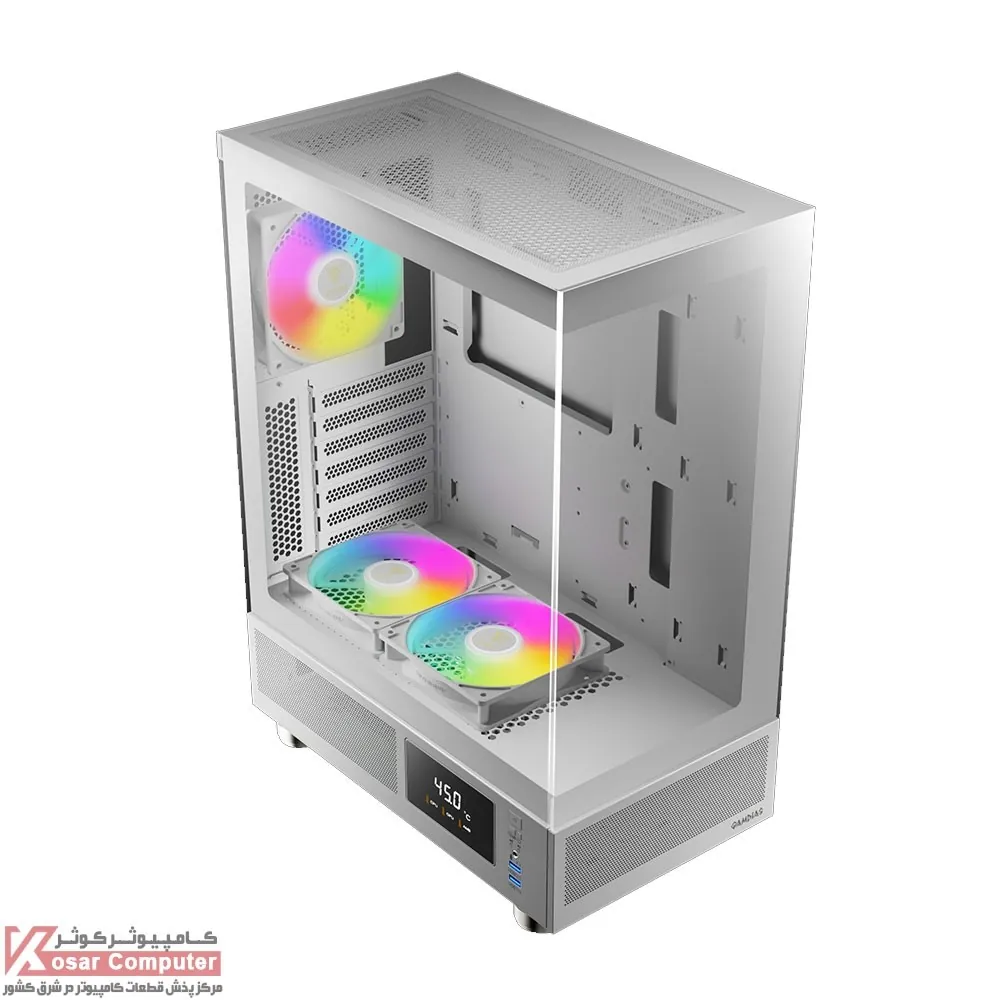 کیس گیم دیاس مدل GAMDIAS ATLAS E1 WH دارای 5 عدد جایگاه فن می باشد که شرکت 3 عدد فن از نوع ARGB روی آن نصب کرده است.در پنل جلویی USB3.0 همراه کنترلر LED و نمایشگر موجود می باشد.همچنین در قسمت بالایی کیس 240 میلی متر کولینگ پشتیبانی می