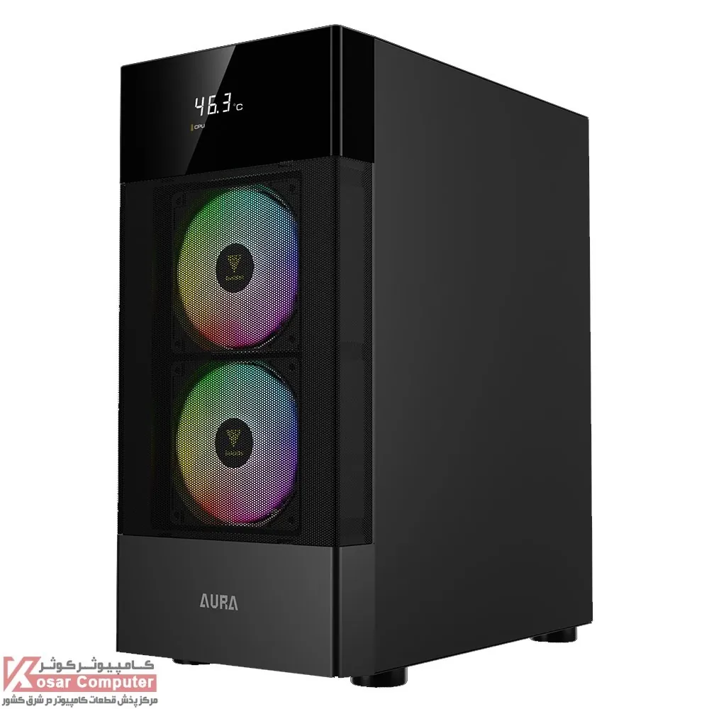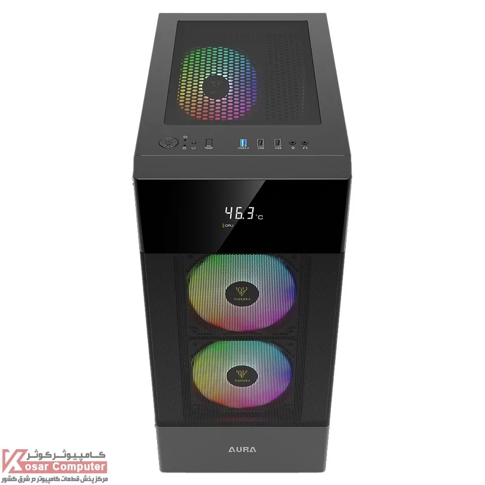 کیس گیم دیاس مدل GAMDIAS AURA GC5 دارای 6 عدد جایگاه فن می باشد که شرکت 3 عدد فن 120 میلی متری از نوع Fixed RGB روی آن نصب کرده است.در پنل جلویی USB3.0 و USB 2.0 همراه کنترلر LED موجود می باشد.همچنین در قسمت جلویی کیس 360 میلی متر کولینگ پشتیبانی می شود