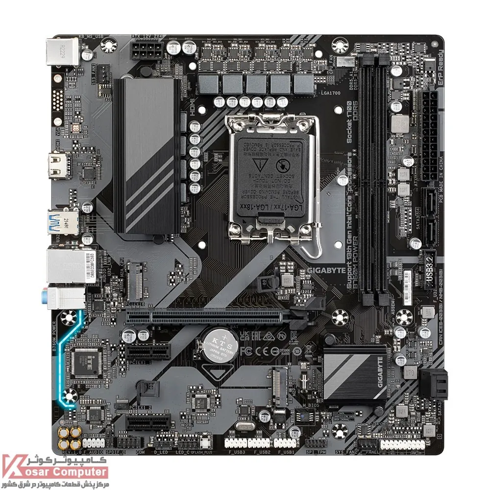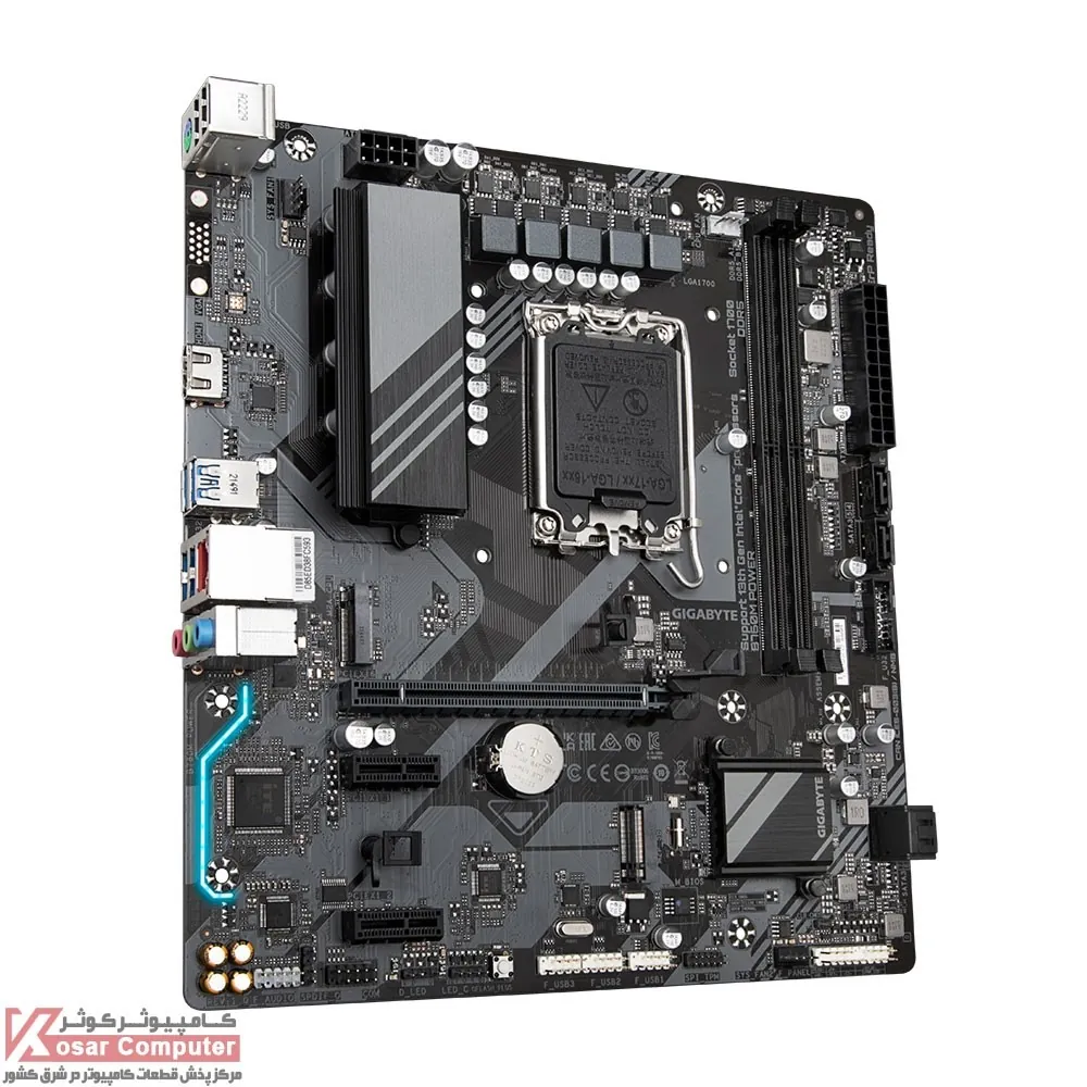 مادربرد گیگابایت B760M POWER از پردازنده های اینتل نسل 12 ، 13 ، 14 و از 128 گیگابایت حافظه رم پرسرعت DDR5 تا باس 8000 مگاهرتز پشتیبانی می کند.همچنین دارای 4 پورت پر سرعت USB 3.2 و یک عدد خروجی تصویر HDMI در پنل پشتی موجود است.