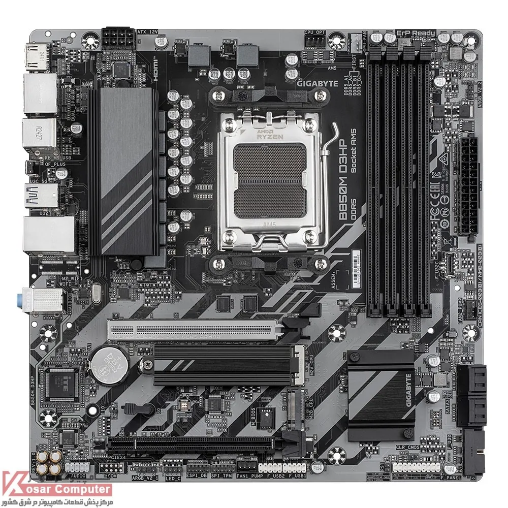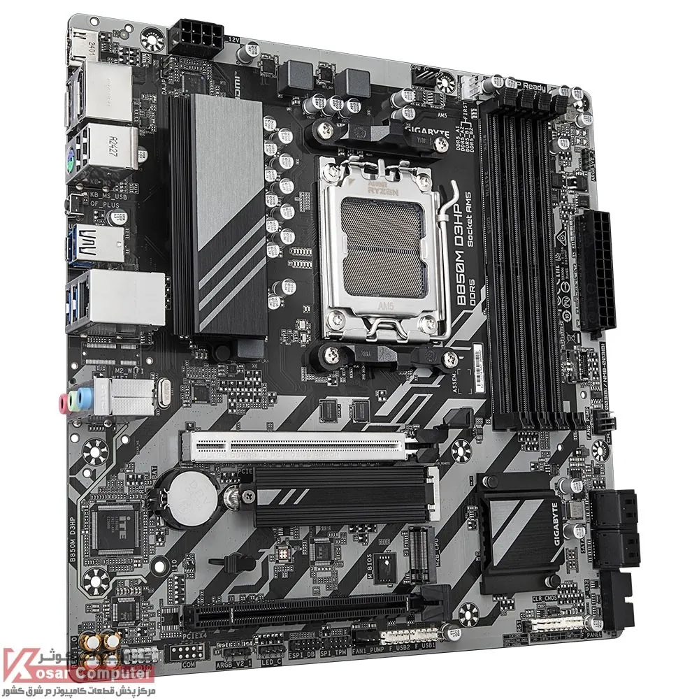 مادربرد ای ام دی DDR5 گیگابایت B850M D3HP از پردازنده های AMD AM5 سری 9000 ، 8000 ، 7000 پشتیبانی می کند.این مادربرد دارای 4 عدد اسلات رم DDR5 است و تا باس 8200 مگاهرتز حافظه رم را می توان روی آن قرار داد.همچنین دارای 2 عدد کانکتور M.2 NME است