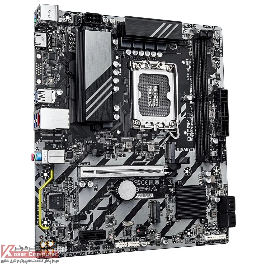مادربرد DDR5 گیگابایت B860M D از پردازنده های اینتل LGA1851 پشتیبانی می کند و دارای 2 عدد اسلات رم DDR5 است و تا باس 8800 مگاهرتز حافظه رم را می توان روی آن قرار داد.همچنین دارای 2 عدد کانکتور M.2 NME است و از قابلیت RAID برای SATA پشتیبانی می کند.