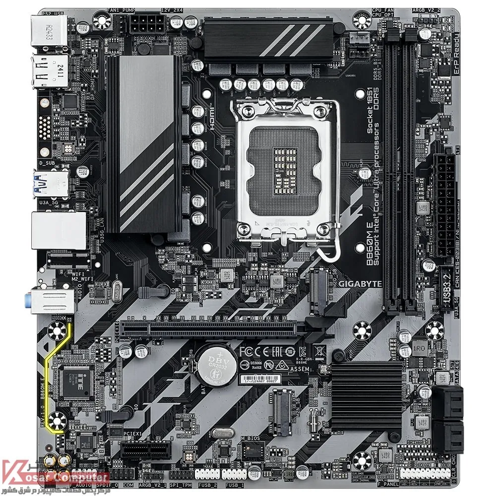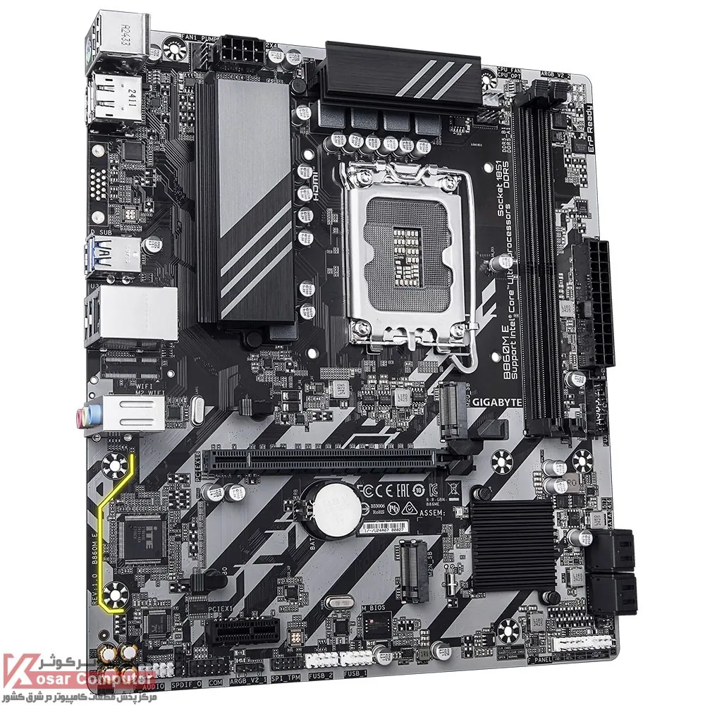 مادربرد DDR5 گیگابایت B860M E از پردازنده های اینتل LGA1851 پشتیبانی می کند و دارای 2 عدد اسلات رم DDR5 است و تا باس 8800 مگاهرتز حافظه رم را می توان روی آن قرار داد.همچنین دارای 2 عدد کانکتور M.2 NME است و از قابلیت RAID برای SATA پشتیبانی می کند.