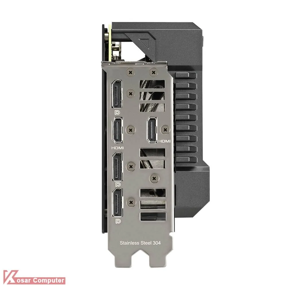 کارت گرافیک گیمینگ ایسوس مدل ASUS TUF Gaming RTX 4070 Ti SUPER OC 16GB دارای 16 گیگابایت حافظه از نوع GDDR6X و رابط 256 یبت همراه با 8448 هسته پردازشی می باشد.در پنل پشتی هم 2 پورت HDMI 2.1 همراه با 3 عدد پورت DisplayPort 1.4a وجود دارد.
