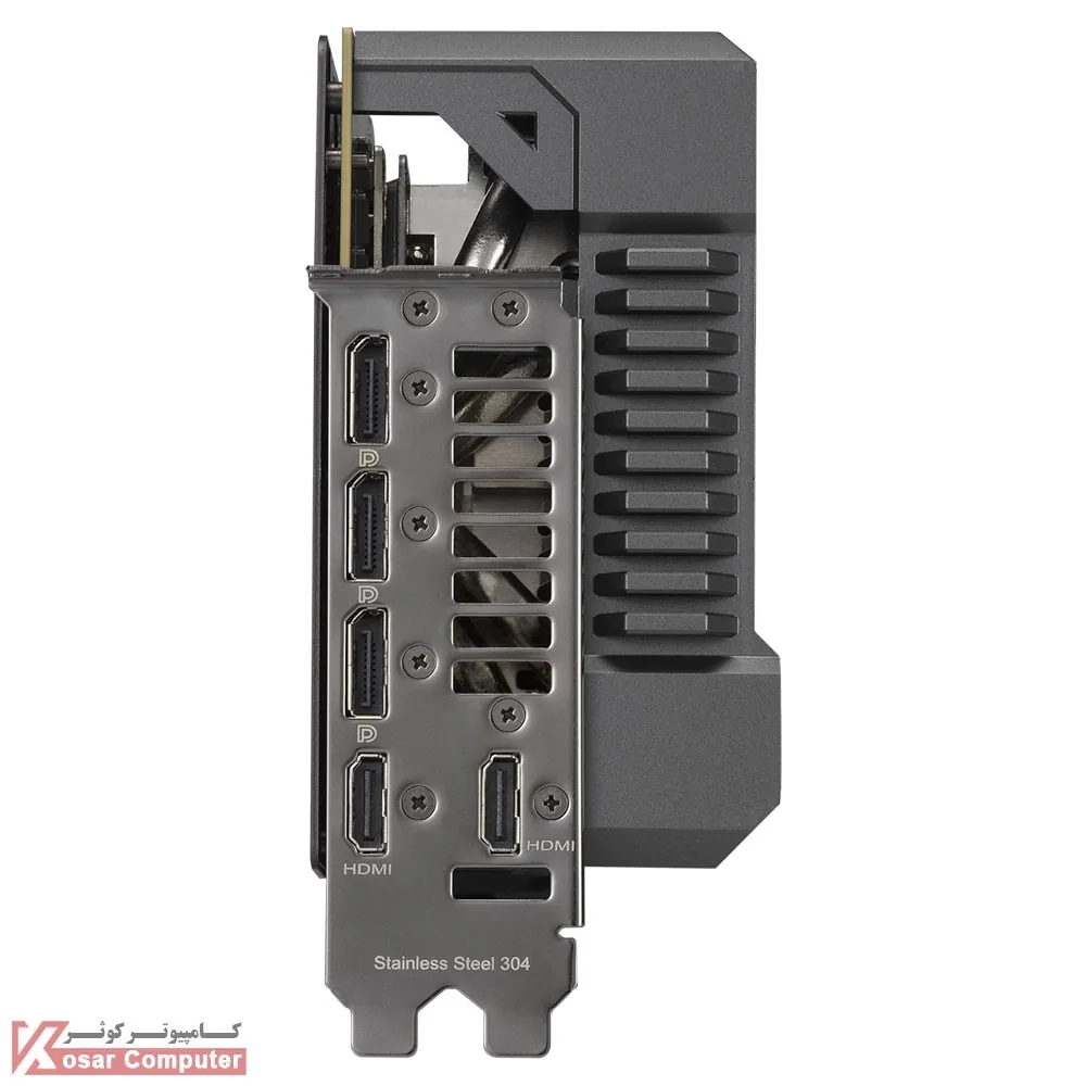 کارت گرافیک ایسوس مناسب پردازشی و گیمینگ مدل ASUS TUF Gaming RTX 4090 OC 24GB دارای 24 گیگابایت حافظه از نوع GDDR6X و رابط 384 یبت همراه با 16384 هسته پردازشی می باشد.در پنل پشتی هم 2 عدد پورت HDMI 2.1a همراه با 3 عدد پورت DisplayPort 1.4a موجود است.