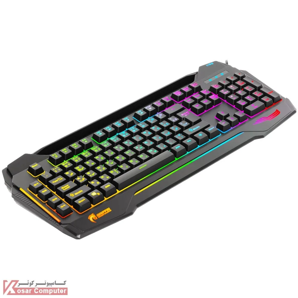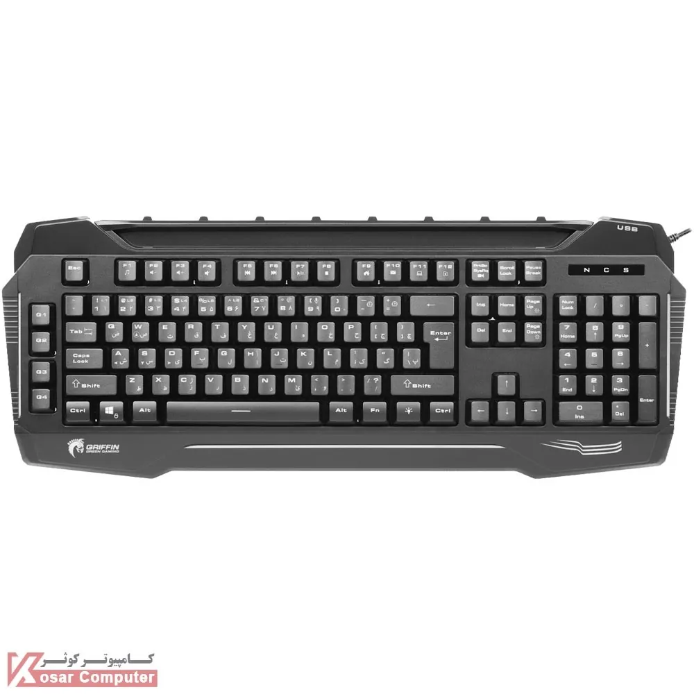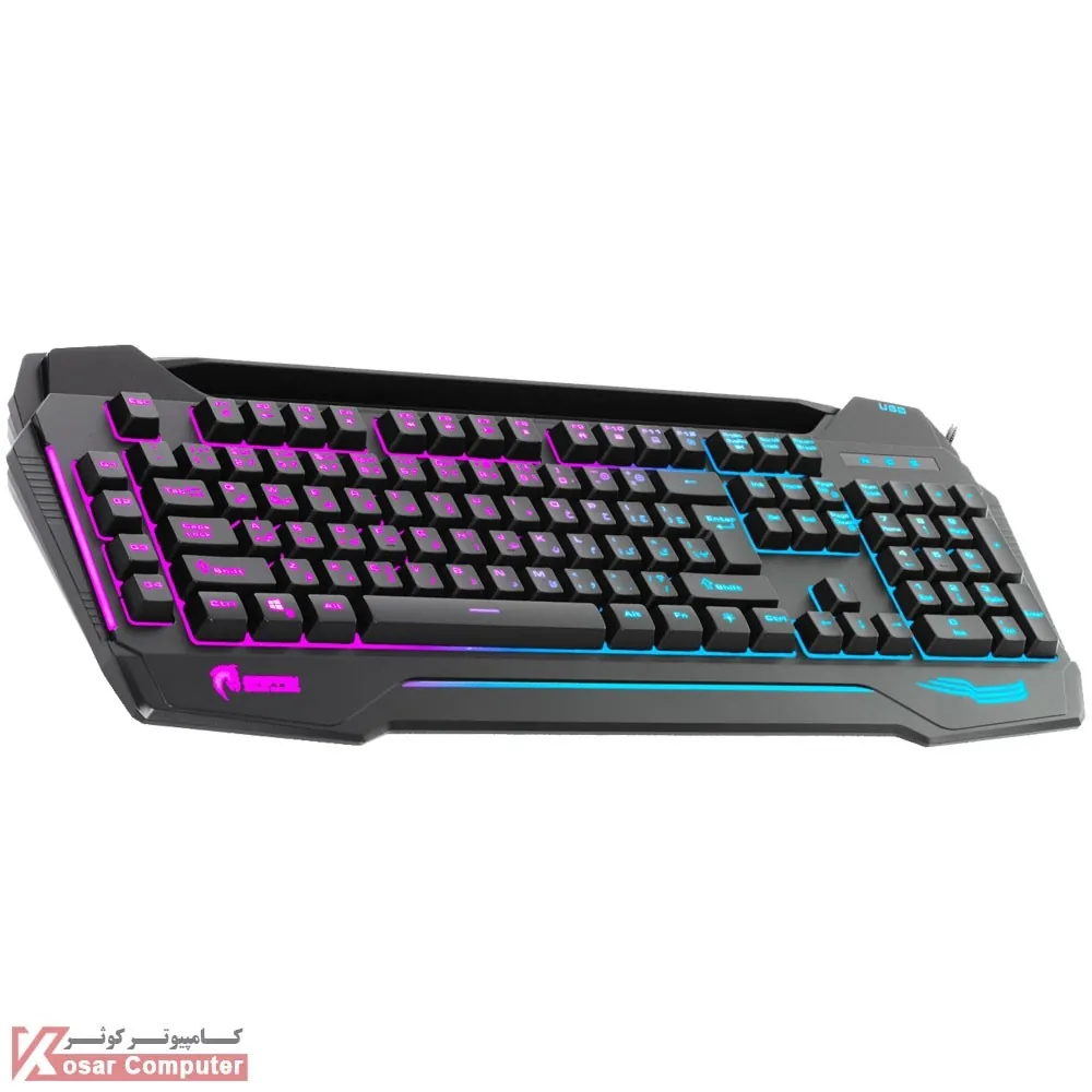 | سایر ویژگی ها | نرخ نمونه برداری (Polling Rate) برابر 1000 هرتز قابلیت فشردن هم زمان کلیدها : دارای 19 کلید با قابلیت Anti Ghosting نوع کلیدها : غشایی (Membrane) تکنیک چاپ حروف بر روی کلیدها : حکاکی لیزری جنس بدنه : ABS Plastic پشتیبانی از قابلیت Game Mode و Windows Lock مجهز به نور پس زمینه RGB به همراه جلوه های نوری زیاد و بسیار جذاب پشتیبانی از فونت فارسی به همراه کلیدهای با فونت فارسی لیزر شده دارای کلید ترکیبی FN برای کنترل عملکردهای مولتی مدیا مجهز به جایگاه مخصوص تلفن همراه یا تبلت در بخش فوقانی |