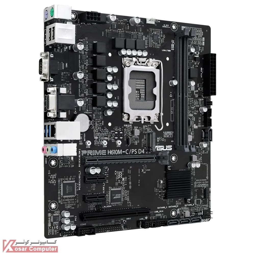 مادربرد ایسوس PRIME H610M-C/PS D4 از پردازنده های نسل 12 و 13 اینتل پشتیبانی می کند.این مادربرددر پنل پشتی دارای پورت کام , پورت DISPLAY , HDMI , VGA , پورت پر سرعت USB 3.2 TYPE-A می باشد.