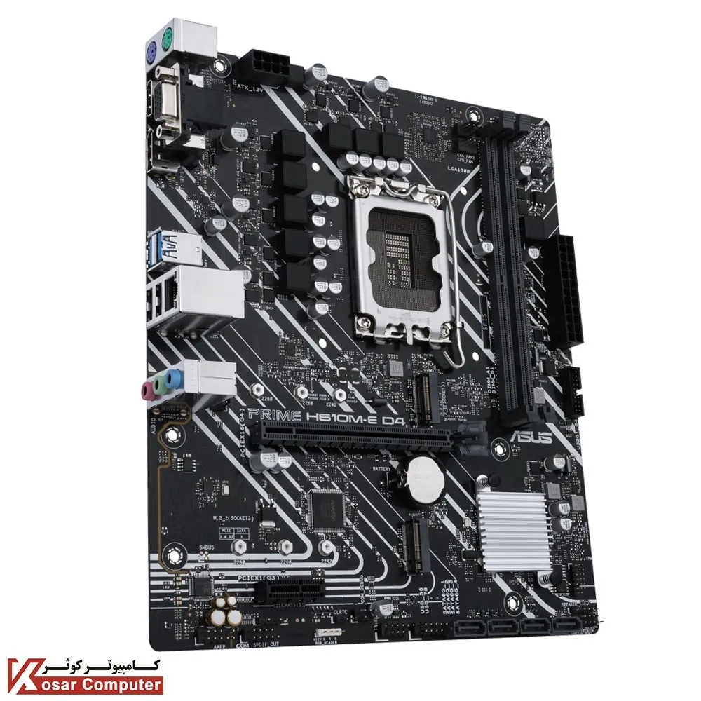 مادربرد قیمت مناسب ایسوس PRIME H610M-E D4 از پردازنده های اینتل نسل 12 پشتیبانی می کند.این مادربرد دارای 2 عدد اسلات رم از نوع DDR4 است و تا باس 3200 مگاهرتز حافظه رم را می توان روی آن قرار داد.در پنل پشتی هم 2 عدد پورت USB 3.2