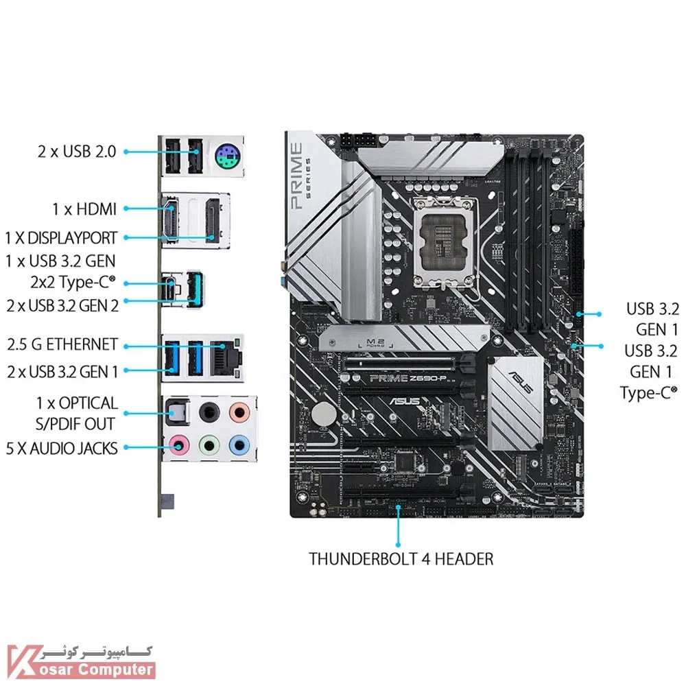 مادربرد قدرتمند ایسوس PRIME Z690-P D4 از پردازنده های نسل 12 اینتل پشتیبانی می کند.این مادربرد دارای 4 عدد اسلات رم از نوع DDR4 است و تا حداکثر باس 5333 مگاهرتز حافظه رم را می توان روی آن قرار داد.در پنل پشتی هم 4 عدد پورت پر سرعت USB 3.2 از نوع TYPE-A و
