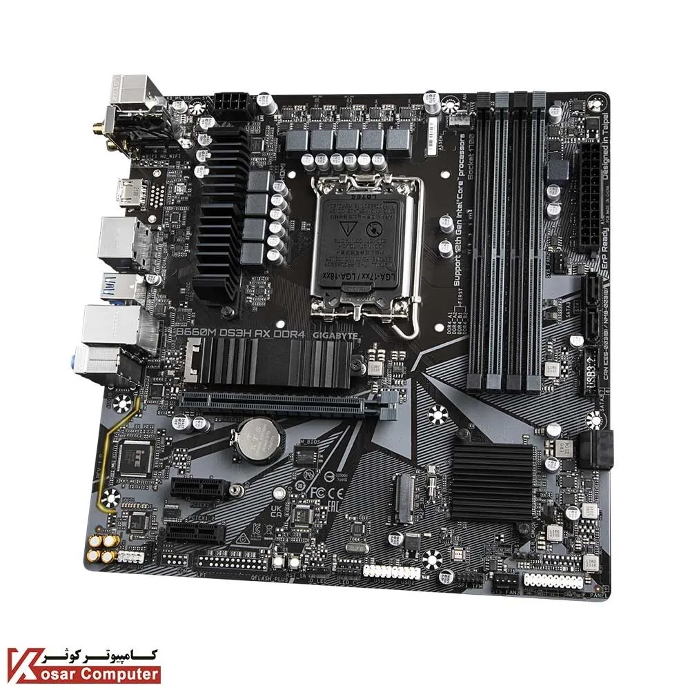 مادربرد بیسیم گیگابایت GIGABYTE B660M DS3H AX DDR4 از پردازنده های نسل 12 اینتل و حافظه های رم DDR4 تا باس 5333 پشتیبانی می کند.همچنین دارای 4 پورت پر سرعت USB 3.2 و خروجی های تصویر 1 عدد HDMI و 2 عدد DISPLAYPORT هم می باشد.گارانتی هم 36 ماه آواژنگ است.