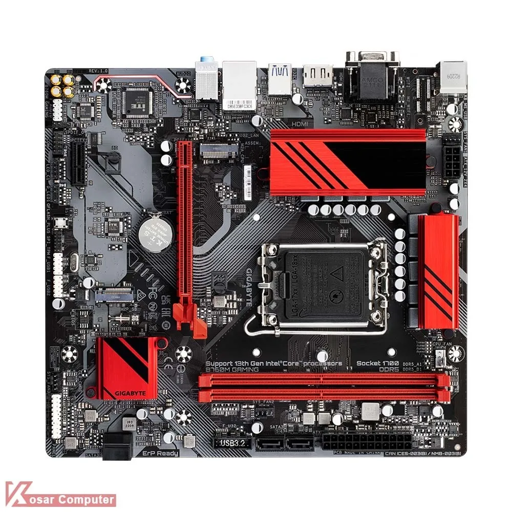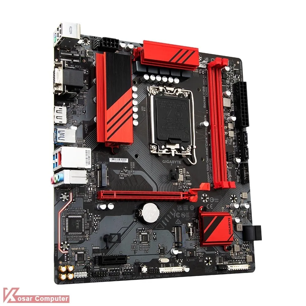 مادربرد گیگابایت B760M GAMING DDR5 از پردازنده های اینتل نسل 12 و 13 و حافظه های رم DDR5 پشتیبانی می کند.همچنین دارای 4 پورت پر سرعت USB 3.2 و خروجی تصویر HDMI و DisplayPort موجود است.همچنین 2 عدد کانکتور M.2 NVME هم دارد.