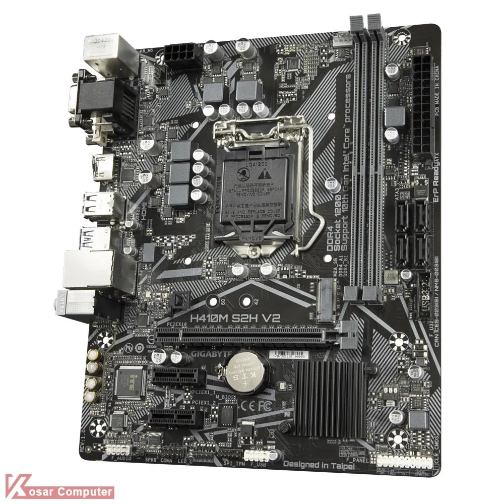 مادربرد گیگابایت H410M-S2H V2 از سوکت LGA-1200 شرکت اینتل پشتیبانی می کند.بر روی این مادربرد 2 عدد اسلات رم DDR4 موجود است و حداکثر 64 گیگابایت حافظه تا باس 2933 مگاهرتز را پشتیبانی می کند.همچنین در پنل پشتی خروجی HDMI , DVI-D , D-SUB موجود است