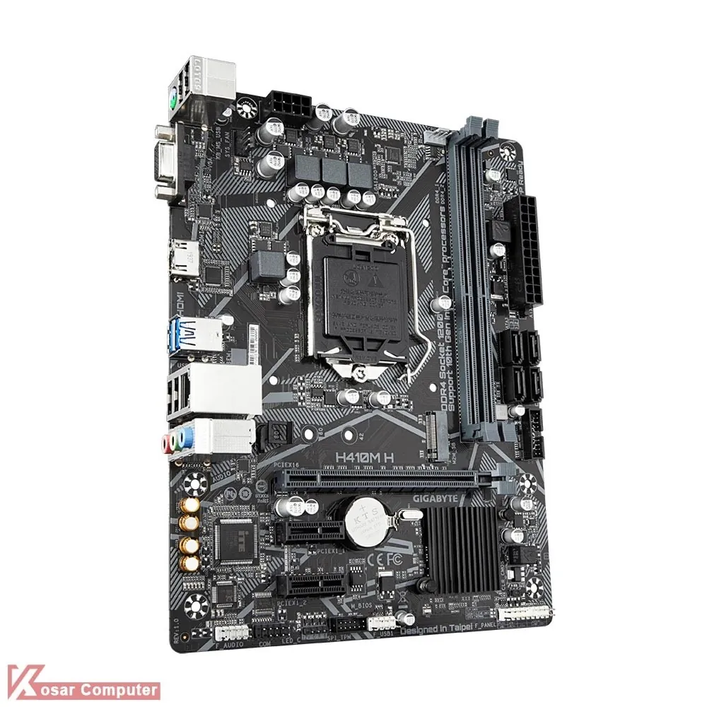 مادربرد گیگابایت H410M-H از سوکت LGA-1200 شرکت اینتل پشتیبانی می کند.بر روی این مادربرد 2 عدد اسلات رم DDR4 موجود است و حداکثر 64 گیگابایت حافظه تا باس 2933 مگاهرتز را پشتیبانی می کند.همچنین در پنل پشتی خروجی HDMI , D-SUB موجود است
