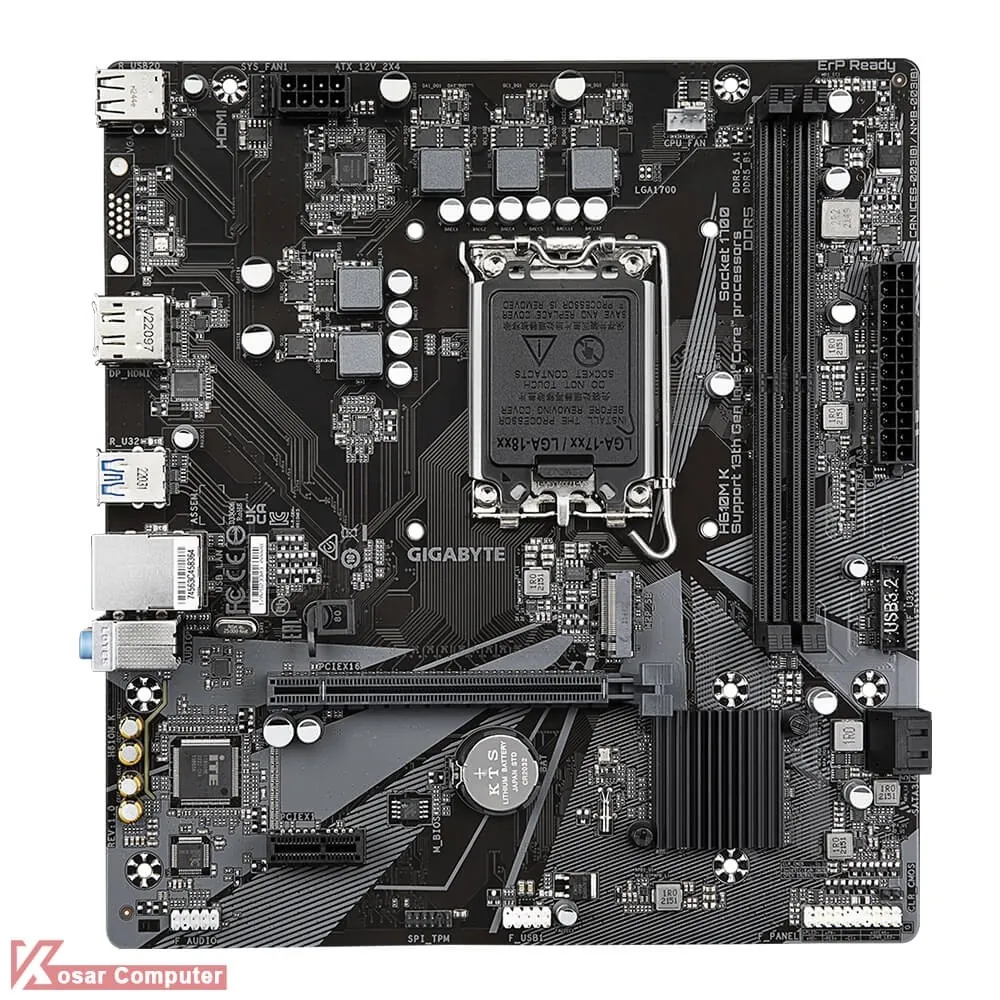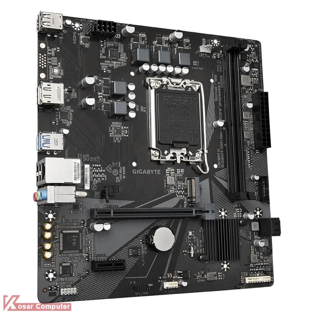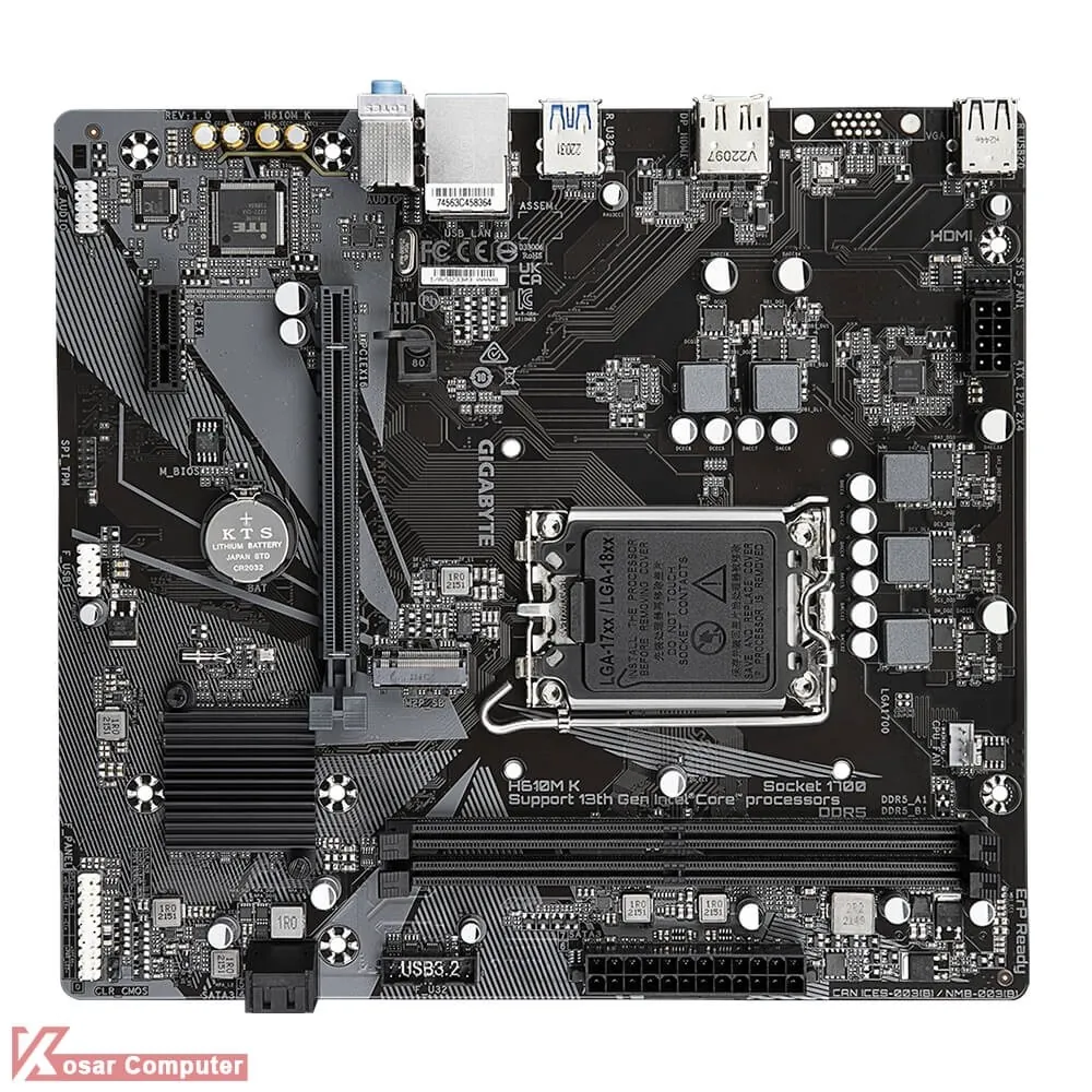 مادربرد گیگابایت GIGABYTE H610M K DDR5 از پردازنده های نسل 12 و 13 اینتل 12TH & 13TH و حافظه های رم DDR5 تا باس 5600 پشتیبانی می کند.همچنین دارای 2 عدد پورت USB 3.2 ، یک عدد کانکتور M.2 NVME ، خروجی تصویر HDMI و DISPLAYPORT می باشد.