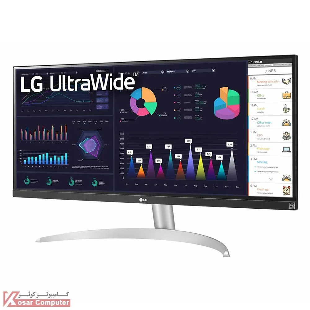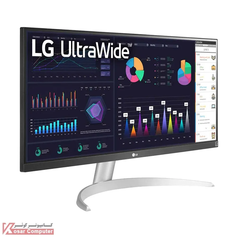 مانیتور ال جی سفید رنگ مدل 29WQ600-W به صورت UltraWide با پنل IPS و سایز 29 اینچ با حداکثر رزولوشن 2560×1080 به صورت فول اچ دی می باشد.در پنل پشتی پورت های HDMI و DisplayPort به همراه پورت TYPE-C موجود می باشد.همچنین دارای 2 عدد اسپیکر 7 وات است.