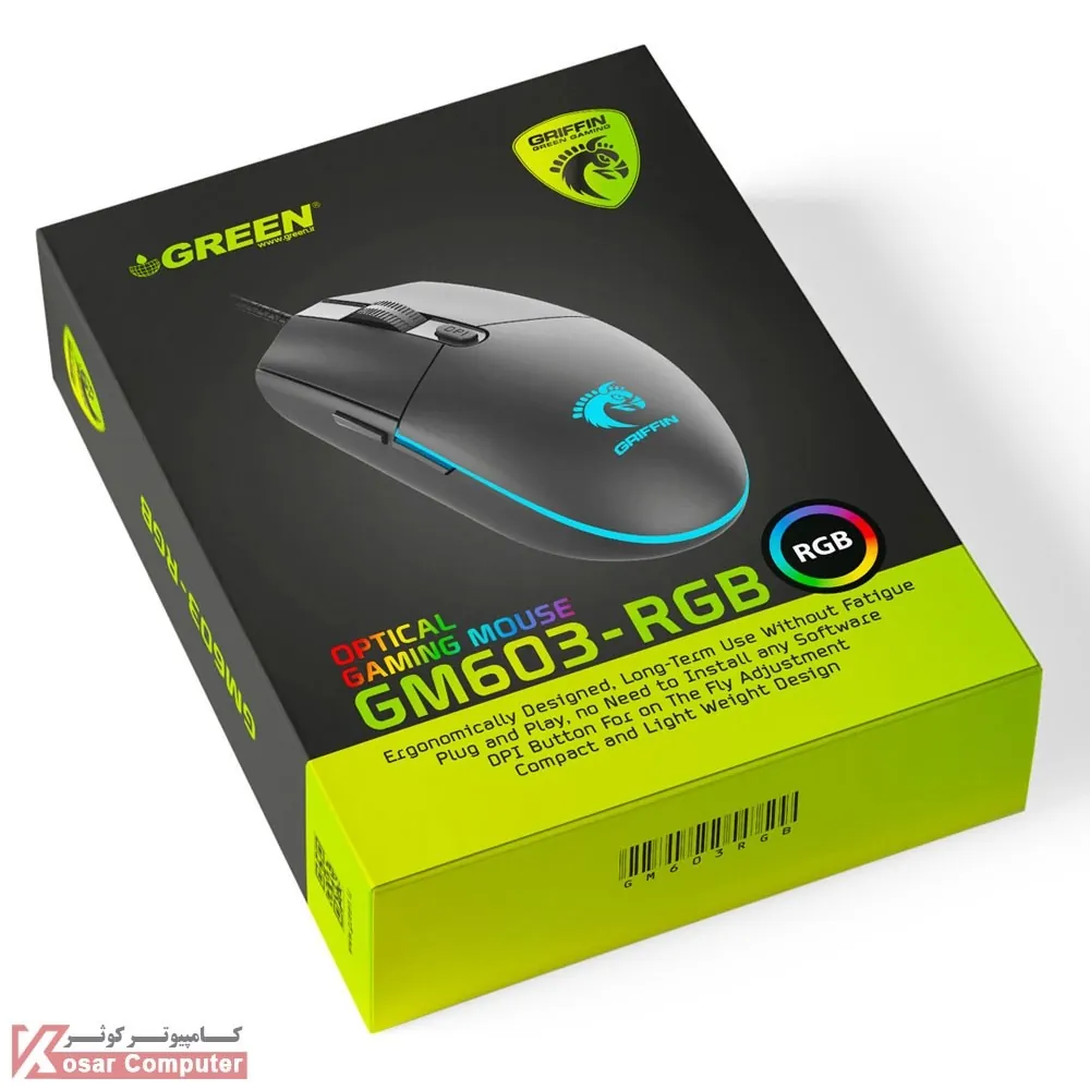 ماوس گرین (GREEN) مدل GM603 RGB باسیم و توسط رابط یو اس بی (USB) به سیستم متصل می شود.این ماوس دارای دقت 3600DPI ، حسگر اپتیکال و 6 عدد کلید می باشد.همچنین دارای طراحی ظاهری خاص و چشم نوازی است و مناسب گیمر هاست.