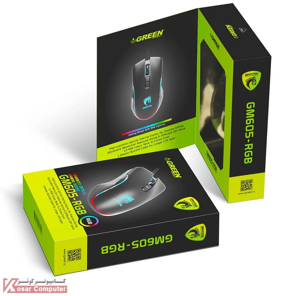 ماوس گرین (GREEN) مدل GM605 RGB باسیم و توسط رابط یو اس بی (USB) به سیستم متصل می شود.این ماوس دارای دقت 7200DPI ، حسگر اپتیکال و 7 عدد کلید می باشد.همچنین دارای طراحی ظاهری خاص و چشم نوازی است و مناسب گیمر هاست.