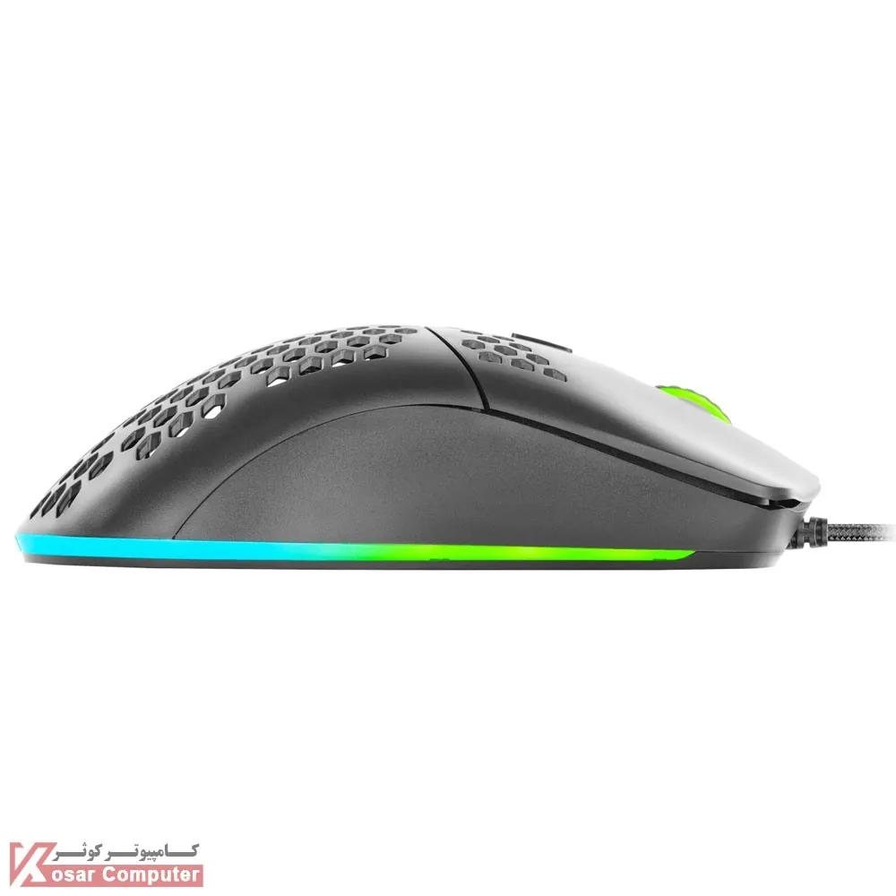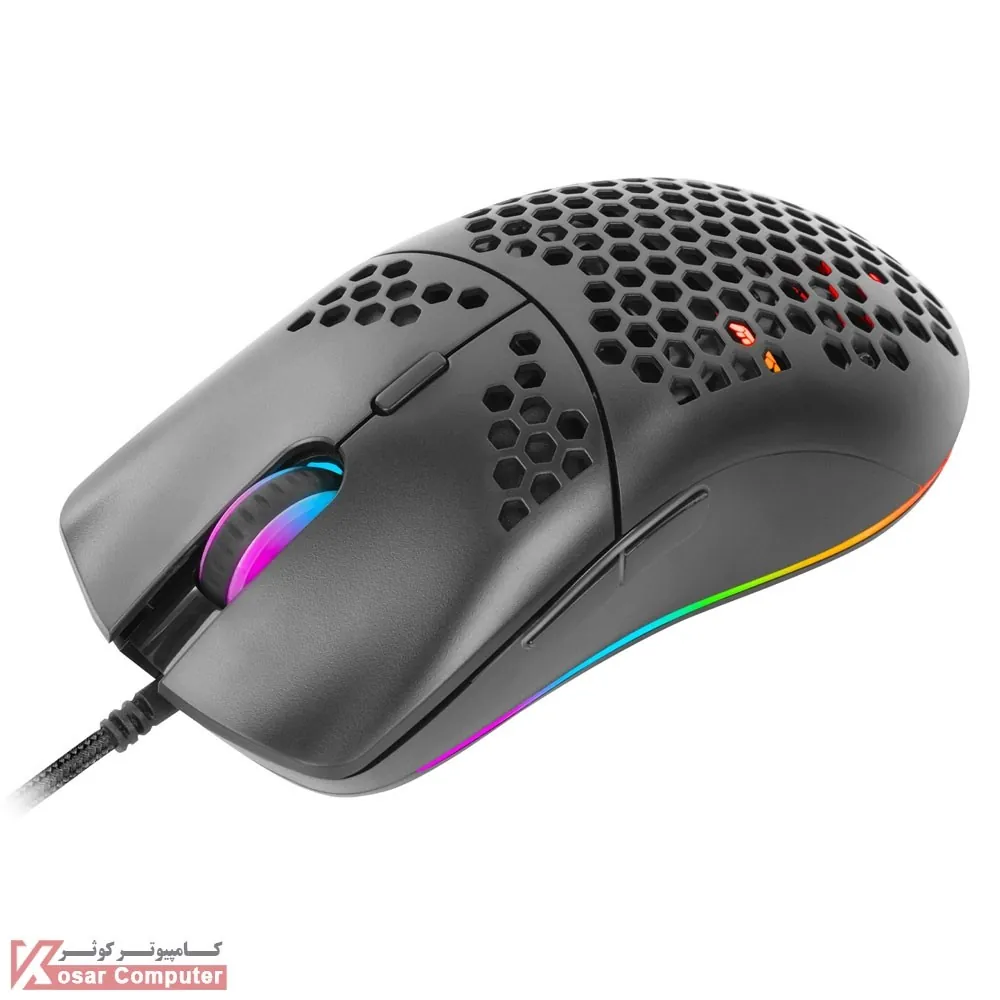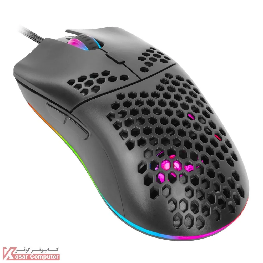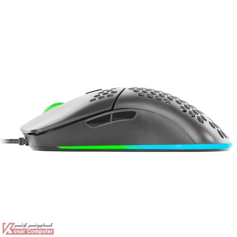 | سایر امکانات | دقت (Resolution) 1200/1600/2400/3200/4800/7200DPI نرخ نمونه برداری (Polling Rate) برابر 125 هرتز پشتیبانی از قابلیت نورپردازی Addressable RGB (ARGB) جنس سیم از روکش کتان بافته شده است مجهز به 6 عدد کلید با قابلیت های تنظیم DPI و backward & Forward مجهز به قابلیت کنترل عملکرد کلید ها و جلوه های نورپردازی ARGB توسط نرم افزار Griffin Panel |