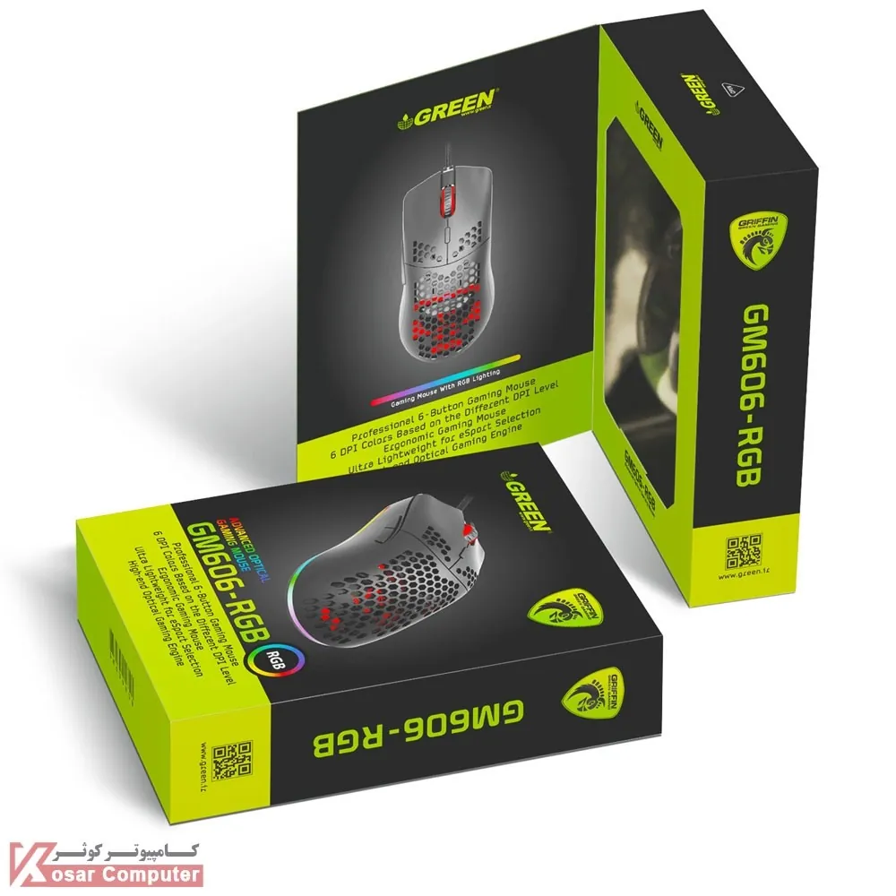 ماوس گرین (GREEN) مدل GM606 RGB باسیم و توسط رابط یو اس بی (USB) به سیستم متصل می شود.این ماوس دارای دقت 7200DPI ، حسگر اپتیکال و 6 عدد کلید می باشد.همچنین مجهز به بدنه مشبک و سبک وزن و تهویه کارآمد است که مورد توجه کاربران حرفه ای به خصوص گیمرها است.