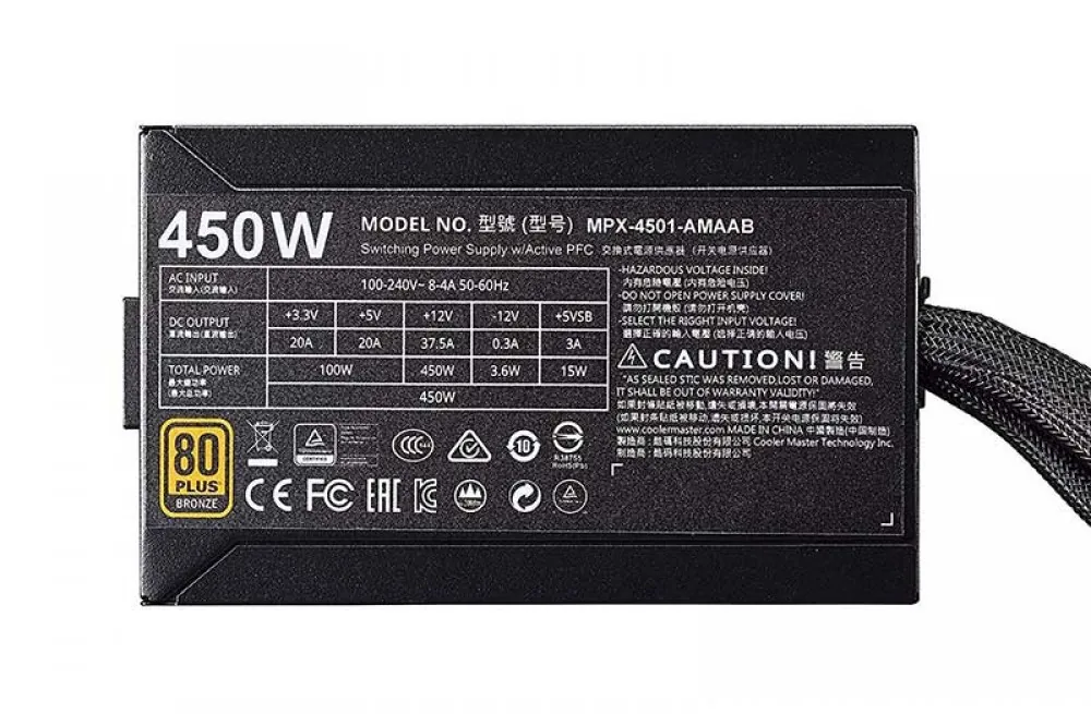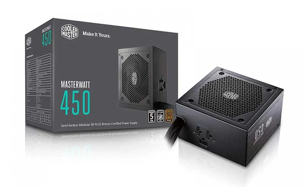 پاور کولر مستر مدل 450 MASTERWATT دارای گواهی 80PLUS BRONZE و نیمه ماژولار می باشد.در این پاور یک عدد کانکتور 24 پین ، یک عدد کانکتور 4+4 پین ، 6 عدد پورت ساتا برای اتصال هارد ، اس اس دی و درایو و 2 عدد کانکتور PCIe 6+2 pin برق مورد نیاز گرافیک موجود است.