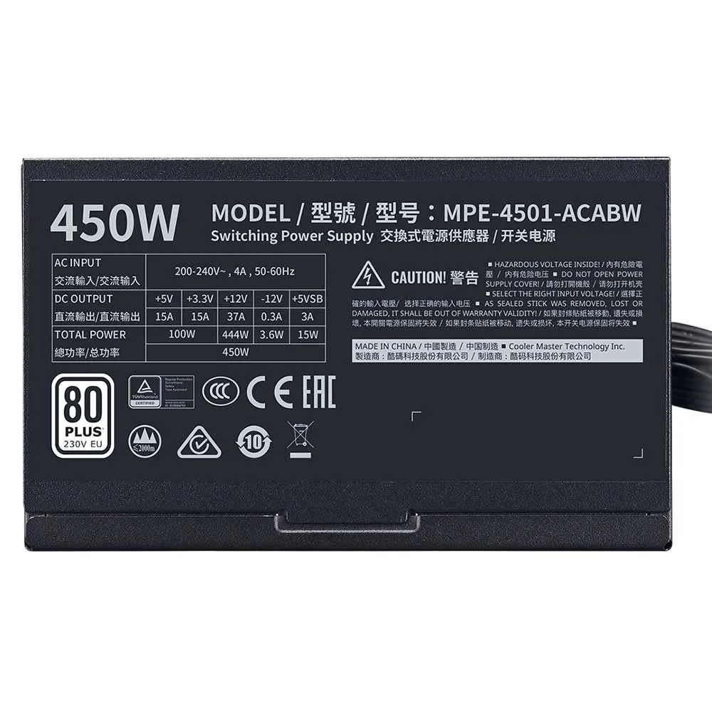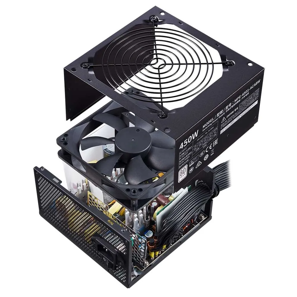 پاور کولرمستر مدل MWE 450 WHITE 230V دارای 450 وات توان می باشد و به صورت غیر ماژولار است.این پاور دارای گواهینامه 80PLUS Standard می باشد و در قسمت پایینی هم یک عدد فن 120 میلی متری موجود است.بر روی این پاور 6 عدد کانکتور ساتا ، 3 عدد کانکتور PERIPHERAL