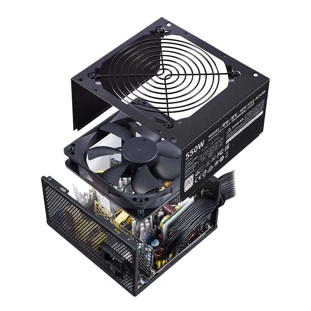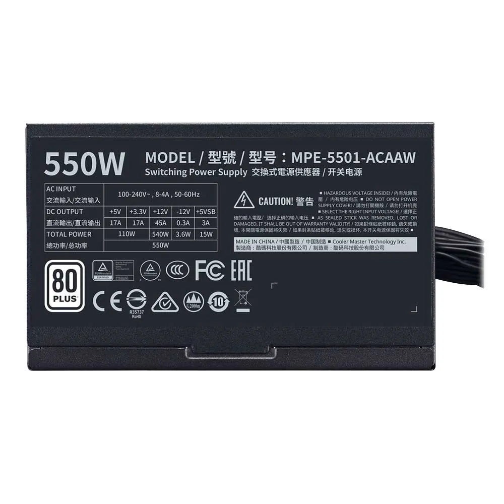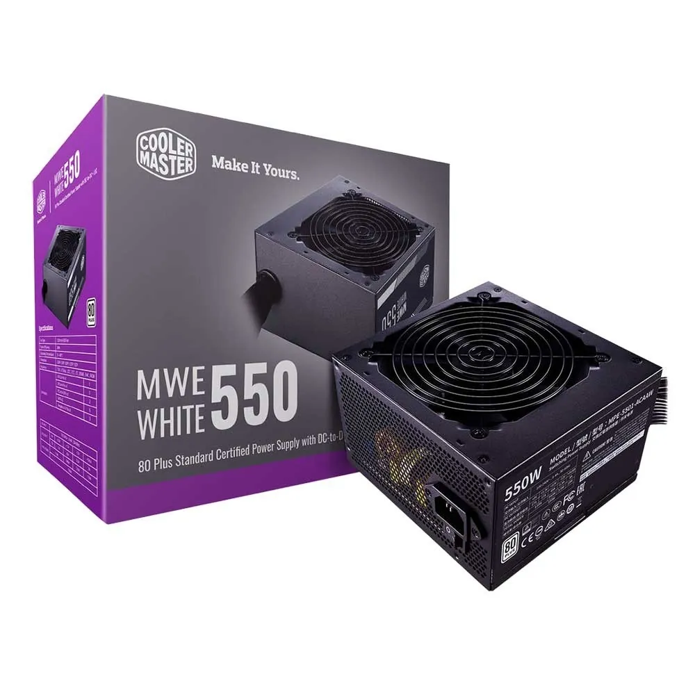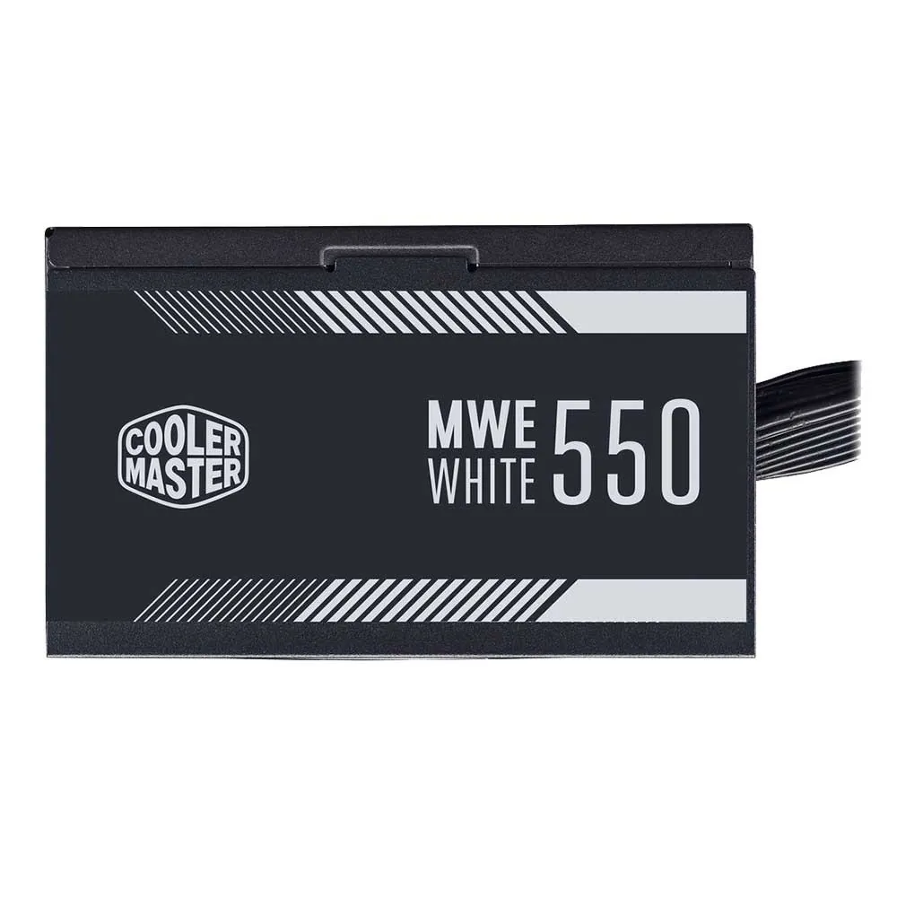 پاور کولرمستر مدل MWE 550 WHITE دارای 550 وات توان می باشد و به صورت غیر ماژولار است.این پاور دارای گواهینامه 80PLUS Standard می باشد و در قسمت پایینی هم یک عدد فن 120 میلی متری موجود است.بر روی این پاور 6 عدد کانکتور ساتا ، 3 عدد کانکتور PERIPHERAL 4-PIN