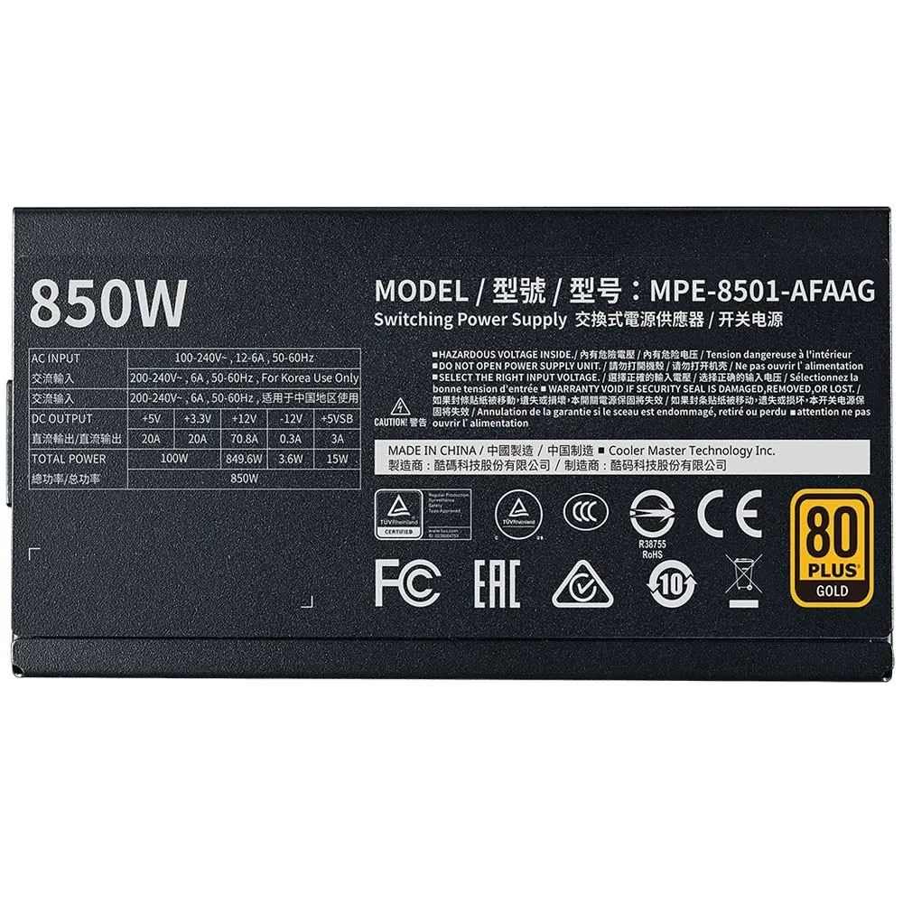 پاور تمام ماژولار 850 وات کولر مستر MWE GOLD 850 گواهینامه 80PLUS GOLD است و مجهز به 12 عدد کانکتور ساتا به همراه 4 عدد کانکتور PCI 6+2 است.این پاور دارای گارانتی آواژنگ می باشد.