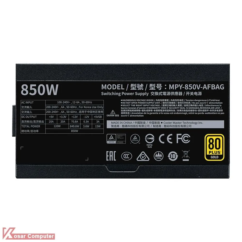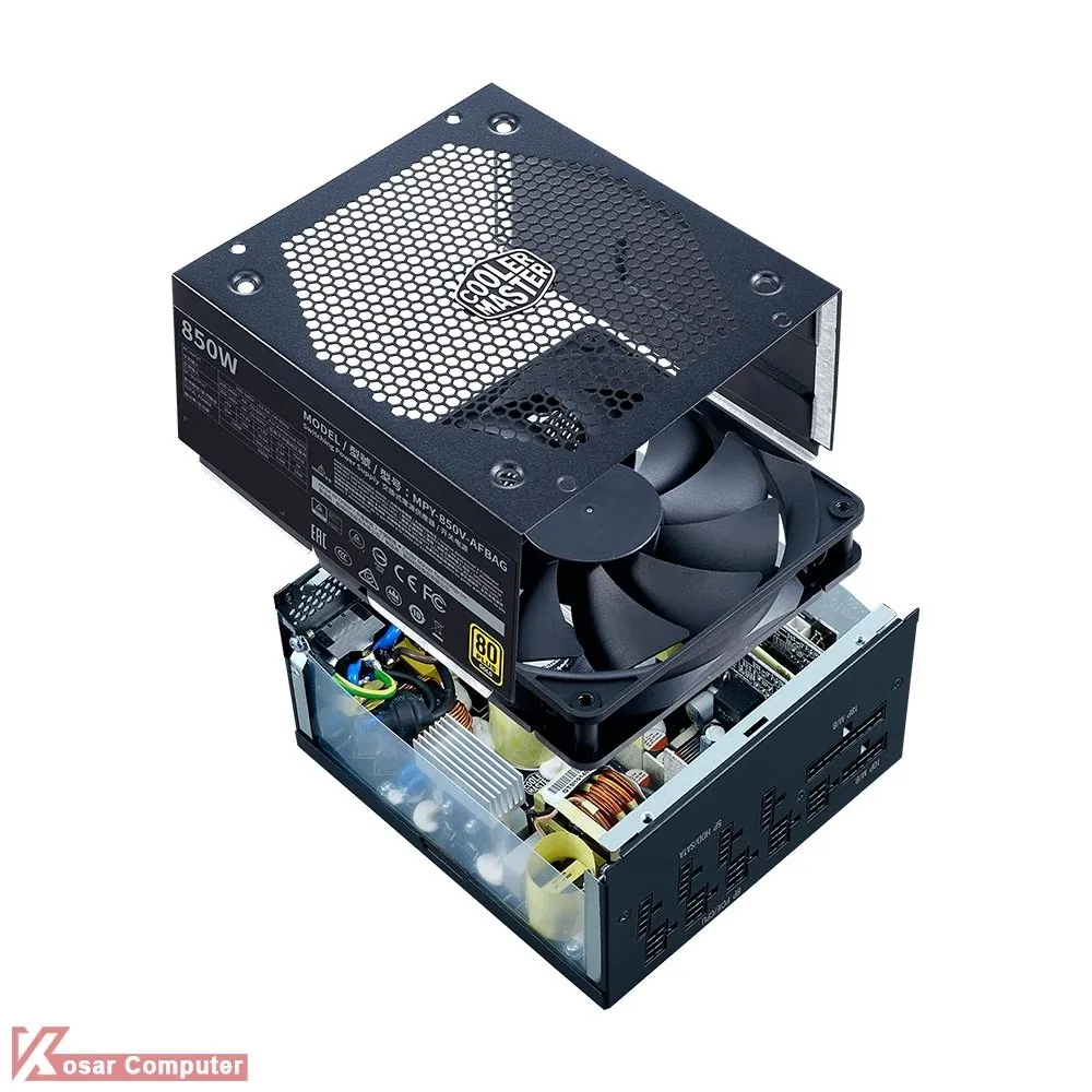 پاور تمام ماژولار 850 وات کولر مستر V850 GOLD – V2 گواهینامه 80PLUS GOLD است و مجهز به 12 عدد کانکتور ساتا به همراه 6 عدد کانکتور PCI 6+2 است.این پاور دارای گارانتی آواژنگ می باشد.