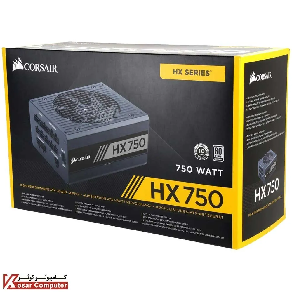 پاور تمام ماژولار 750 وات کورسیر HX750 مجهز به گواهینامه 80PLUS PLATINUM است و دارای به 20 عدد کانکتور ساتا به همراه 8 عدد کانکتور PCI 6+2 است.