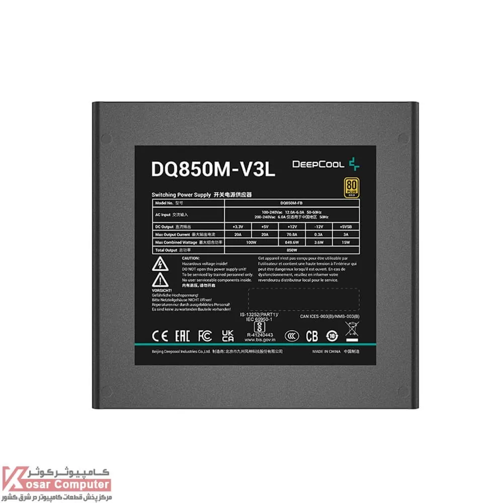 پاور 850 وات تمام ماژولار دیپ کول DQ850M V3L مجهز به گواهینامه 80PLUS GOLD است و دارای دو عدد کانکتور پردازنده 4+4 پین ، 3 عدد کانکتور 2+6 پین و 8 عدد کانکتور ساتا می باشد.