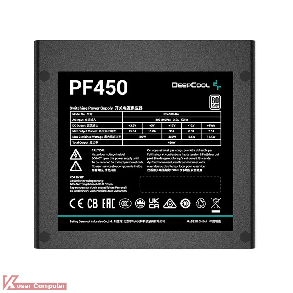 پاور 450 وات دیپ کول PF450 مجهز به گواهینامه 80PLUS WHITE است و دارای یک عدد کانکتور پردازنده 4+4 پین ، 2 عدد کانکتور 2+6 پین و 3 عدد کانکتور ساتا می باشد.