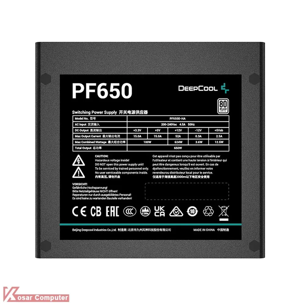 پاور 650 وات دیپ کول PF650 مجهز به گواهینامه 80PLUS WHITE است و دارای دو عدد کانکتور پردازنده 4+4 پین ، 4 عدد کانکتور 2+6 پین و 6 عدد کانکتور ساتا می باشد.
