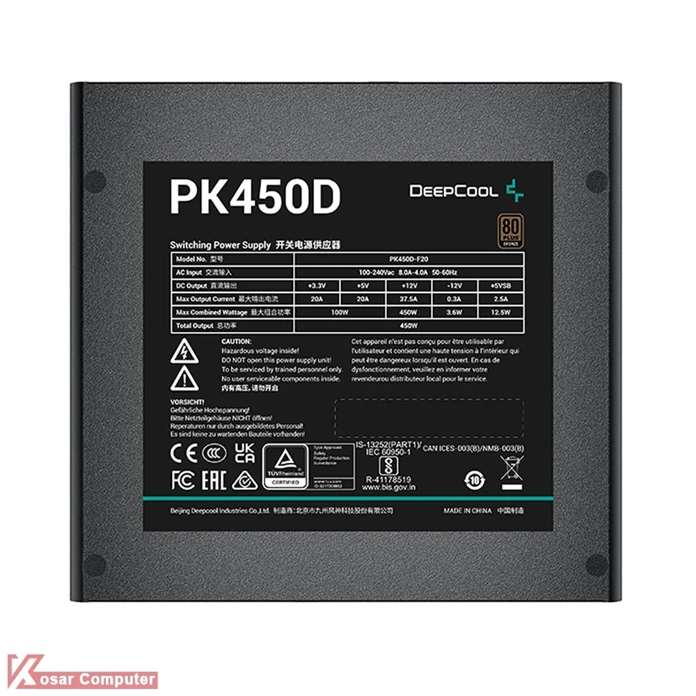 پاور 450 وات دیپ کول PK450D مجهز به گواهینامه 80PLUS BRONZE است و دارای یک عدد کانکتور پردازنده 4+4 پین ، 2 عدد کانکتور 2+6 پین و 6 عدد کانکتور ساتا می باشد.