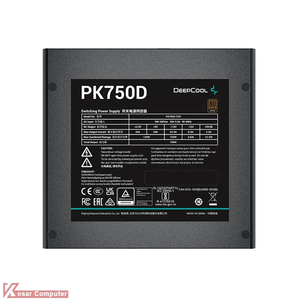 پاور 750 وات دیپ کول PK750D مجهز به گواهینامه 80PLUS BRONZE است و دارای دو عدد کانکتور پردازنده 4+4 پین ، 4 عدد کانکتور 2+6 پین و هشت عدد کانکتور ساتا می باشد.