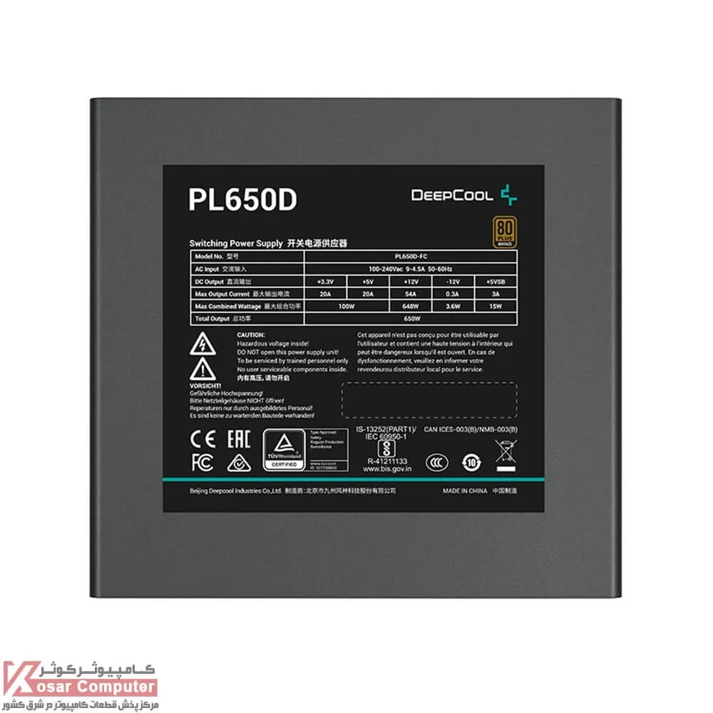 پاور 650 وات دیپ کول PL650D ATX 3.0 مجهز به گواهینامه 80PLUS BRONZE است و دارای کانکتور 16 پین برق گرافیک ، دو عدد کانکتور پردازنده 4+4 پین ، 3 عدد کانکتور 2+6 پین و 6 عدد کانکتور ساتا می باشد.