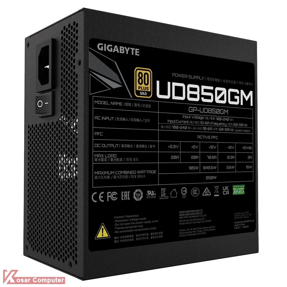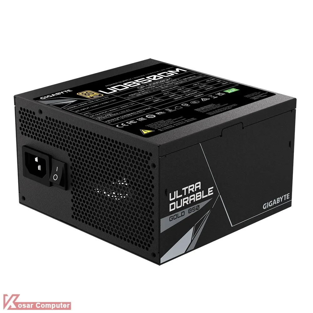 پاور گیگابایت مدل UD850GM دارای 850 وات توان می باشد و به صورت فول ماژولار است.این پاور دارای گواهینامه 80PLUS GOLD می باشد و در قسمت پایینی هم یک عدد فن 120 میلی متری موجود است.بر روی این پاور 8 عدد کانکتور ساتا ، 4 عدد کانکتور PCI-E 6+2 …